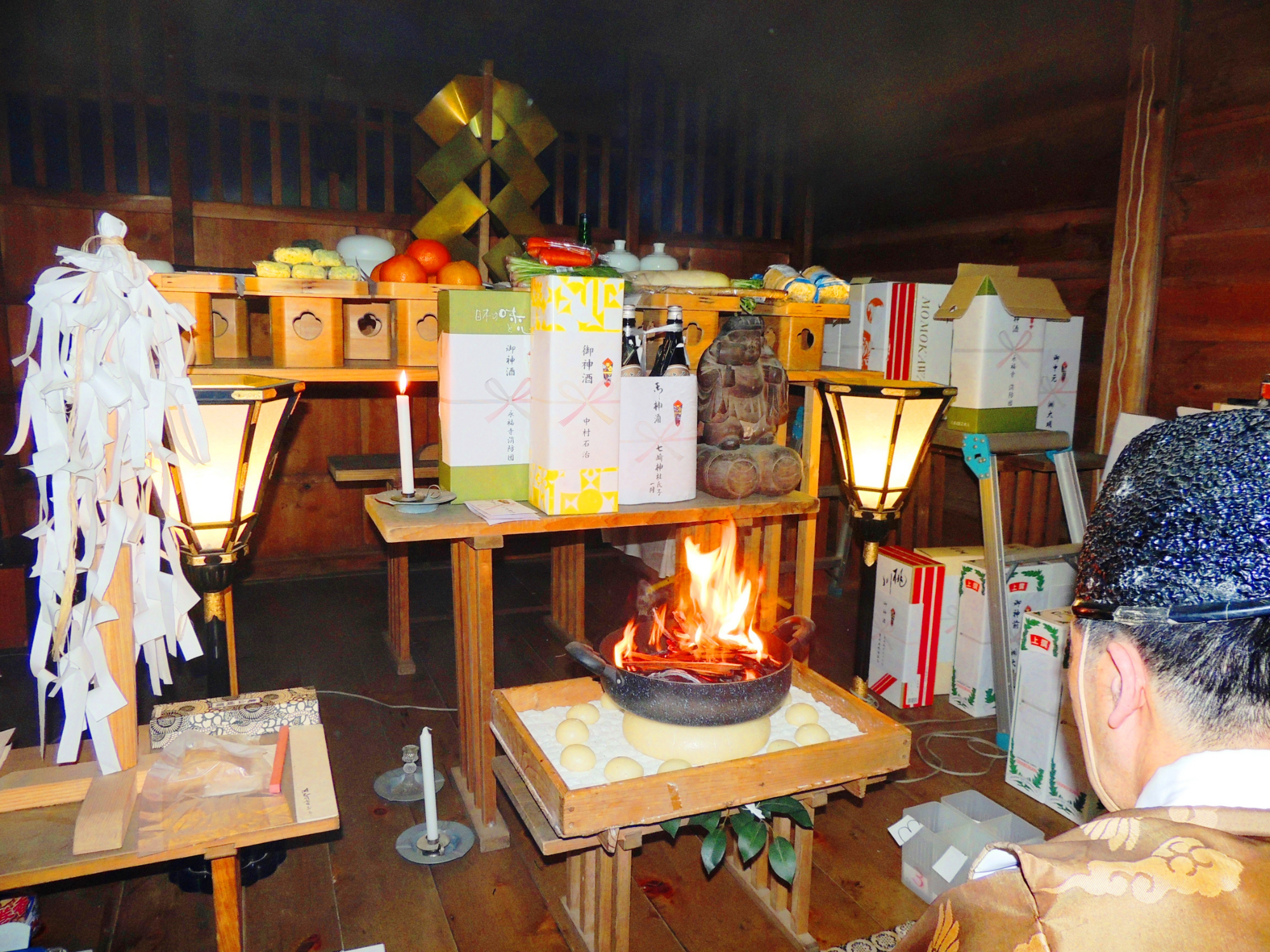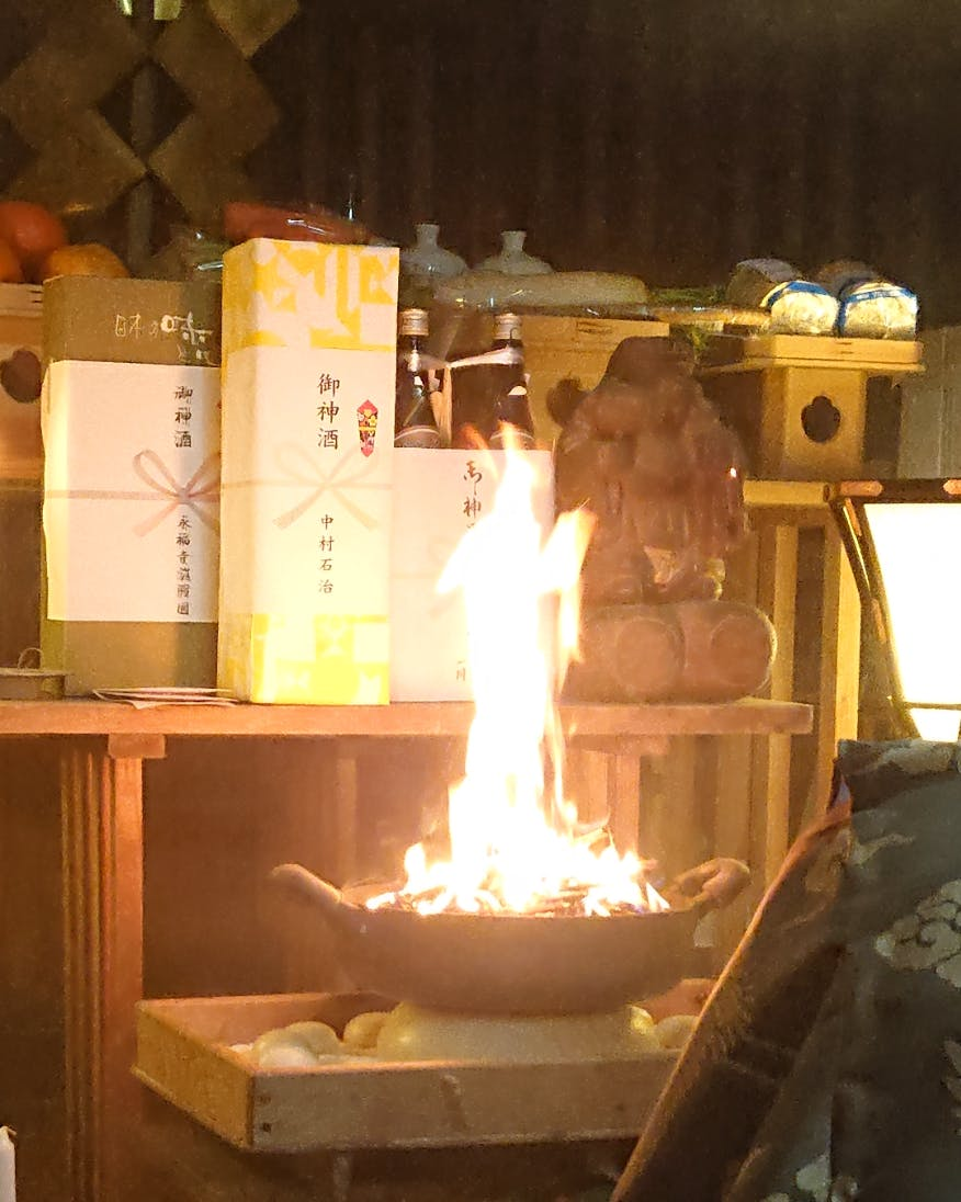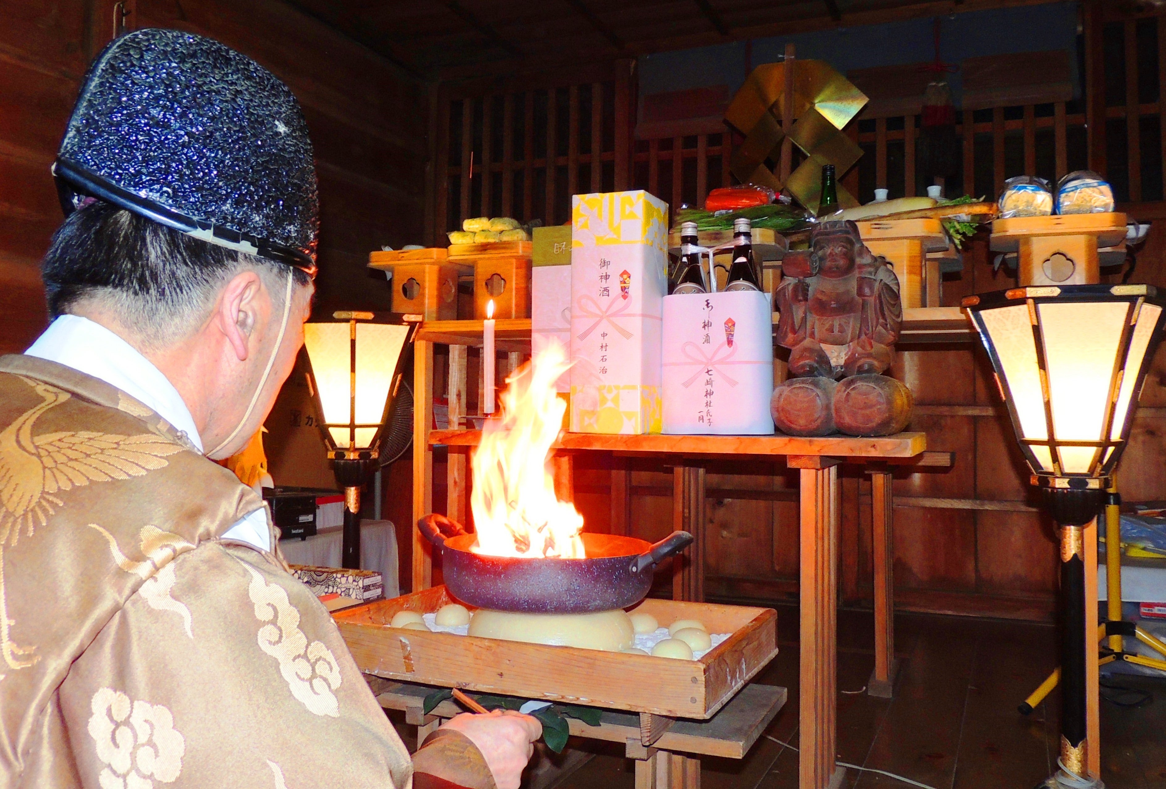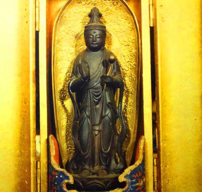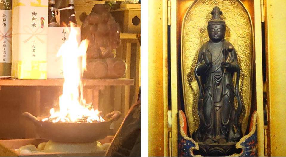 画像・七崎神社拝殿祭壇前:右側のご本尊仏像を少し左側から見てください、「炎と化し現れた御神体」と全く同じ形状をしています。詳しくは「炎と化し現れた御神体」をご参照ください。