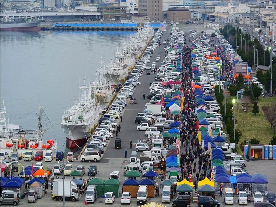 画像:日本最大級の八戸黄金の朝市「館鼻岸壁朝市」L字型会場の一部です。