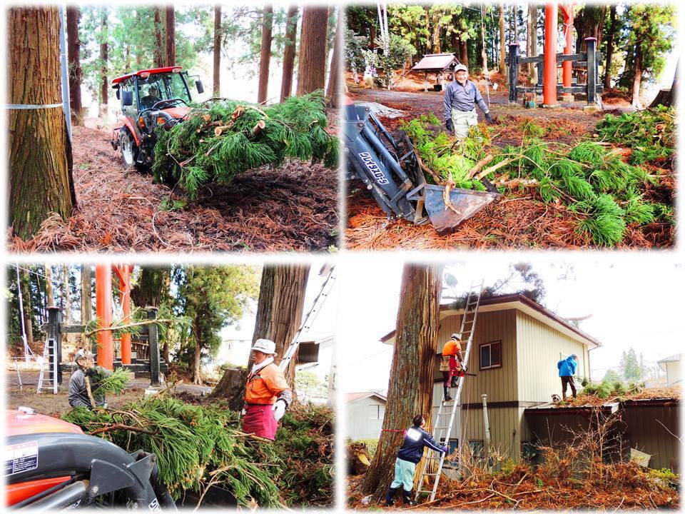 〇3月27日「雨雪 で折れた枝・枯れ葉の撤去作業」:八戸市では、3月というのに雨雪が20Cm程積もり、鎮守の杜の大杉に通常の雪より3倍も重くのしかかり、多くの枝が折れ境内に散乱。「永久の会」会長・理事長他、青年部が繰り出し、境内の清掃に汗を流しました。