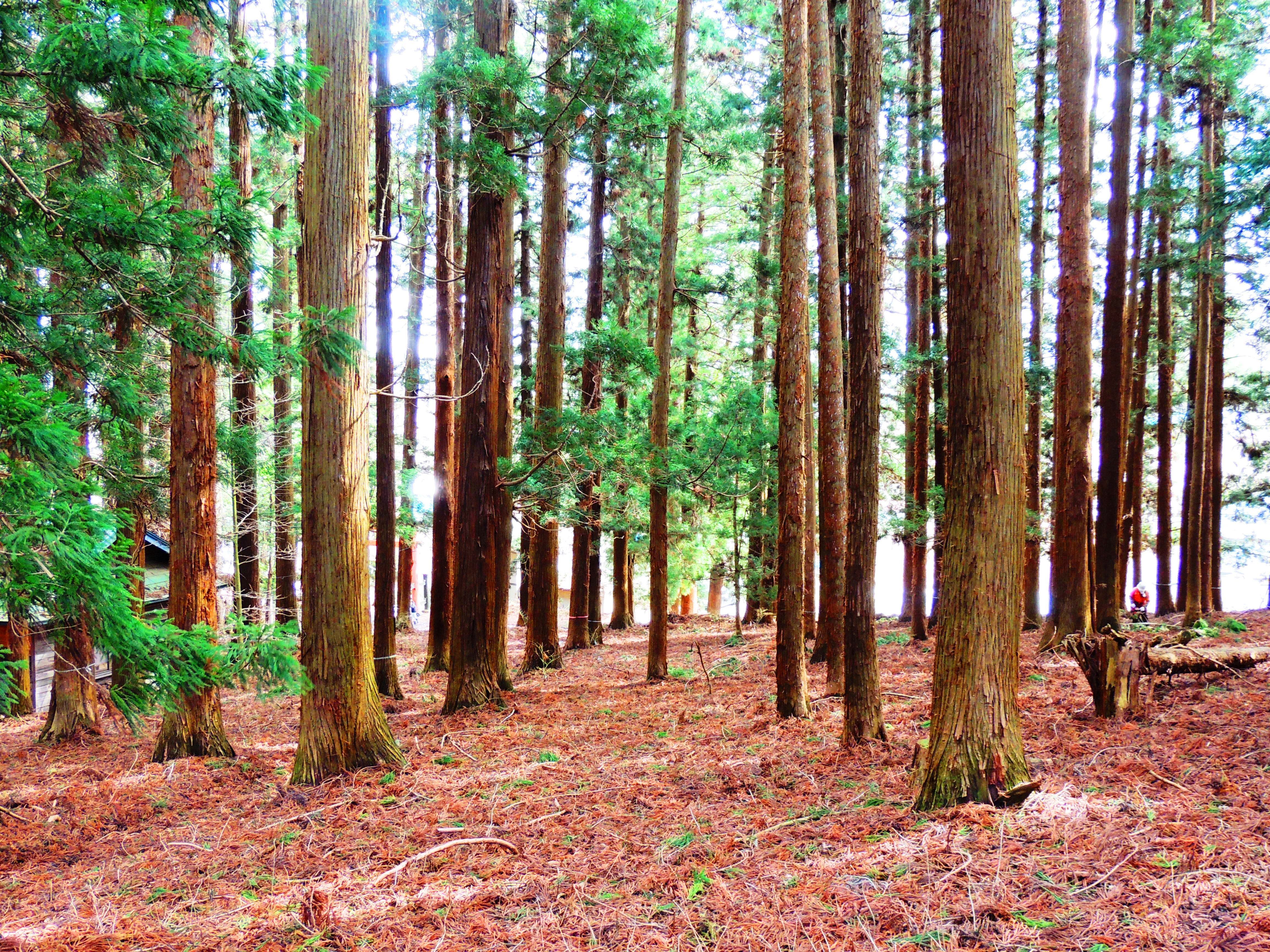 画像:大杉一千本の「鎮守の杜」内部。右の折れた木の上に赤い上着を着たスタッフ。比較すると樹高がイメージできます。樹高33m前後です。手前の大杉の幹幅は2m弱です。