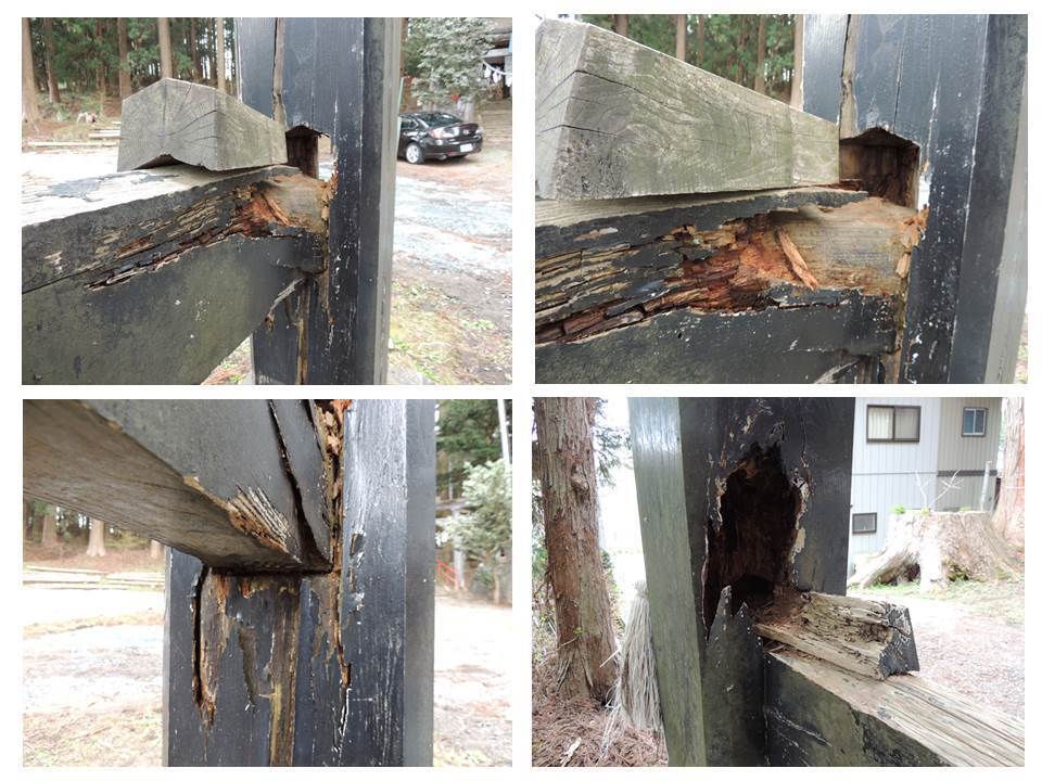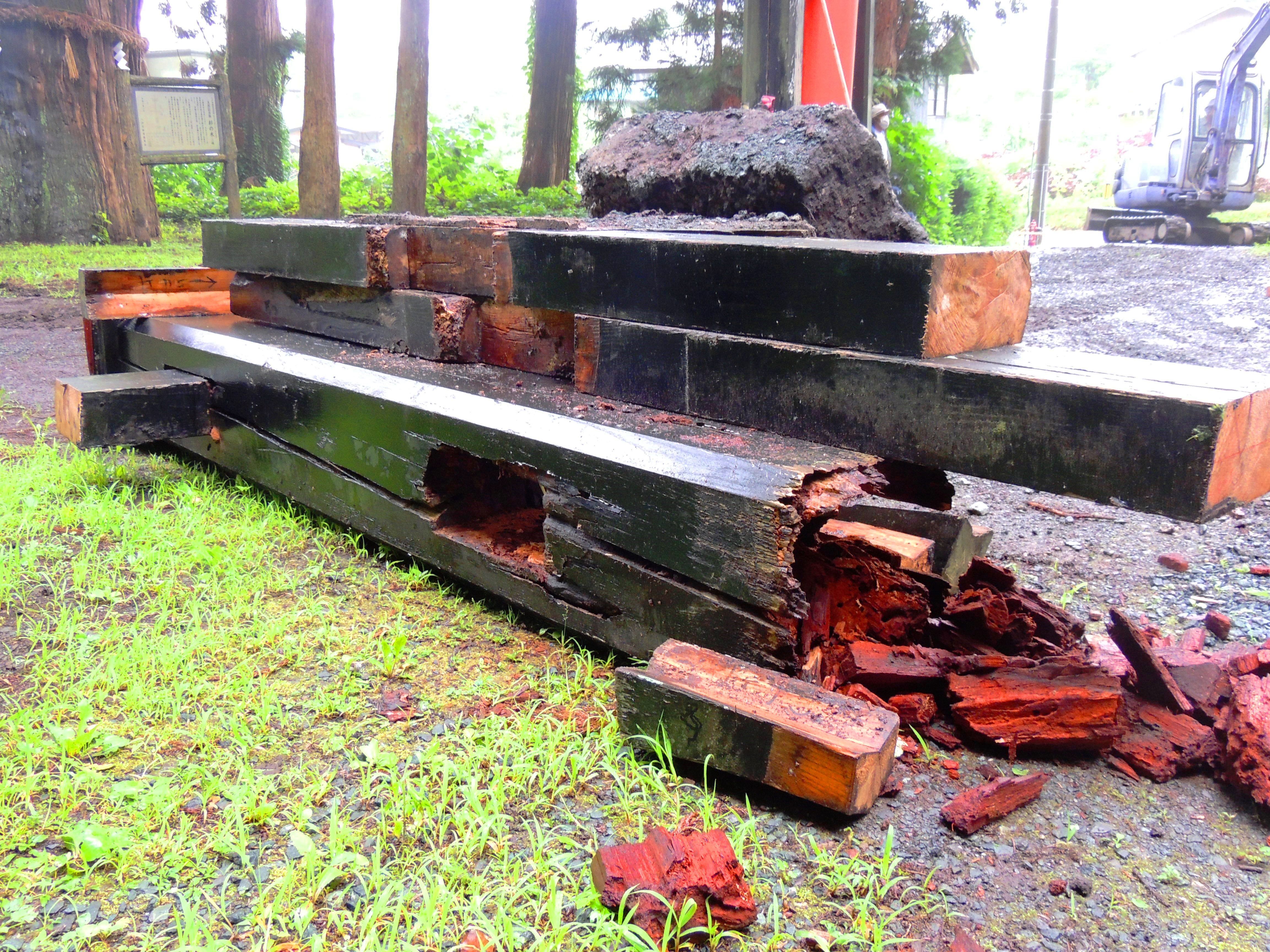 画像:取り外された「控え柱&貫」は、朽ち果て崩壊寸前だったことが判明。 太い二本の柱は宮大工棟梁の見定め通りしっかりとしていた。両部鳥居の構造は地面に埋め込まなくても倒れない構造で厳島神社の海に浮かぶ両部鳥居に代表されます。