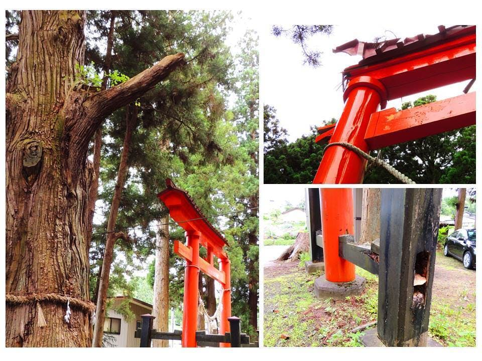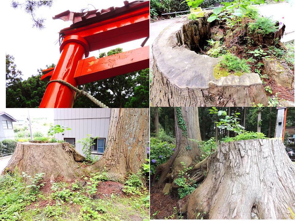 画像:左=八戸市指定文化財天然記念物推定樹齢一千年の北斗の「矛杉/ほこすぎ」と、台風10号で被災した「希望の星☆大鳥居」の無残な姿