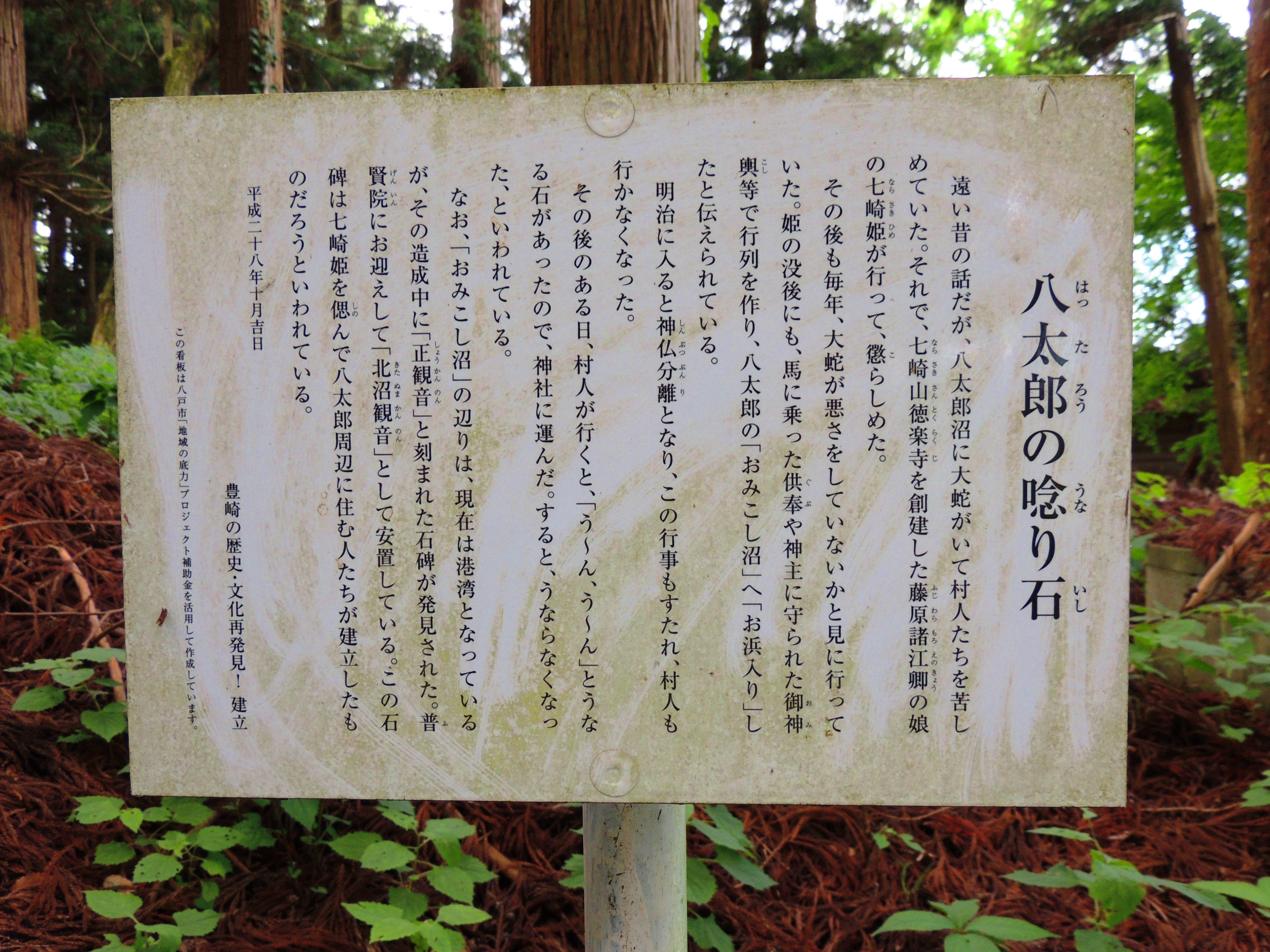 八太郎(蓮沼)に大蛇が住んでおり、毎年美しい娘を捧げなければならなかった。今年はある村の長者の一人娘と定まっていた。都から流されてきた藤原諸江卿の娘「七崎姫」がこの話を聞き、一巻のお経と刀を持って身代わりになるという。村人は嘆き悲しみながらも、姫を神輿に乗せて沼のほとりまで運び、祭壇をしつらえ、姫を残して立ち去った。続きはこちら→ 「七崎姫の伝説」