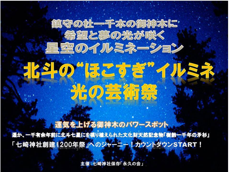 七崎神社には、遥か、一千有余年も前に、「平和の象徴」北斗七星(北斗)に 平和を願い、「希望と繁栄」を託し、星座を模り御神木「7本の杉」を植樹したその内「3本」が残ったとする、承伝が記されています。「北斗七星」は、平和を象徴する星座で「希望を叶える」星座ともされています。樹齢一千有余年の御神木大杉が「北斗 の鉾杉」と言い伝わる由縁です。