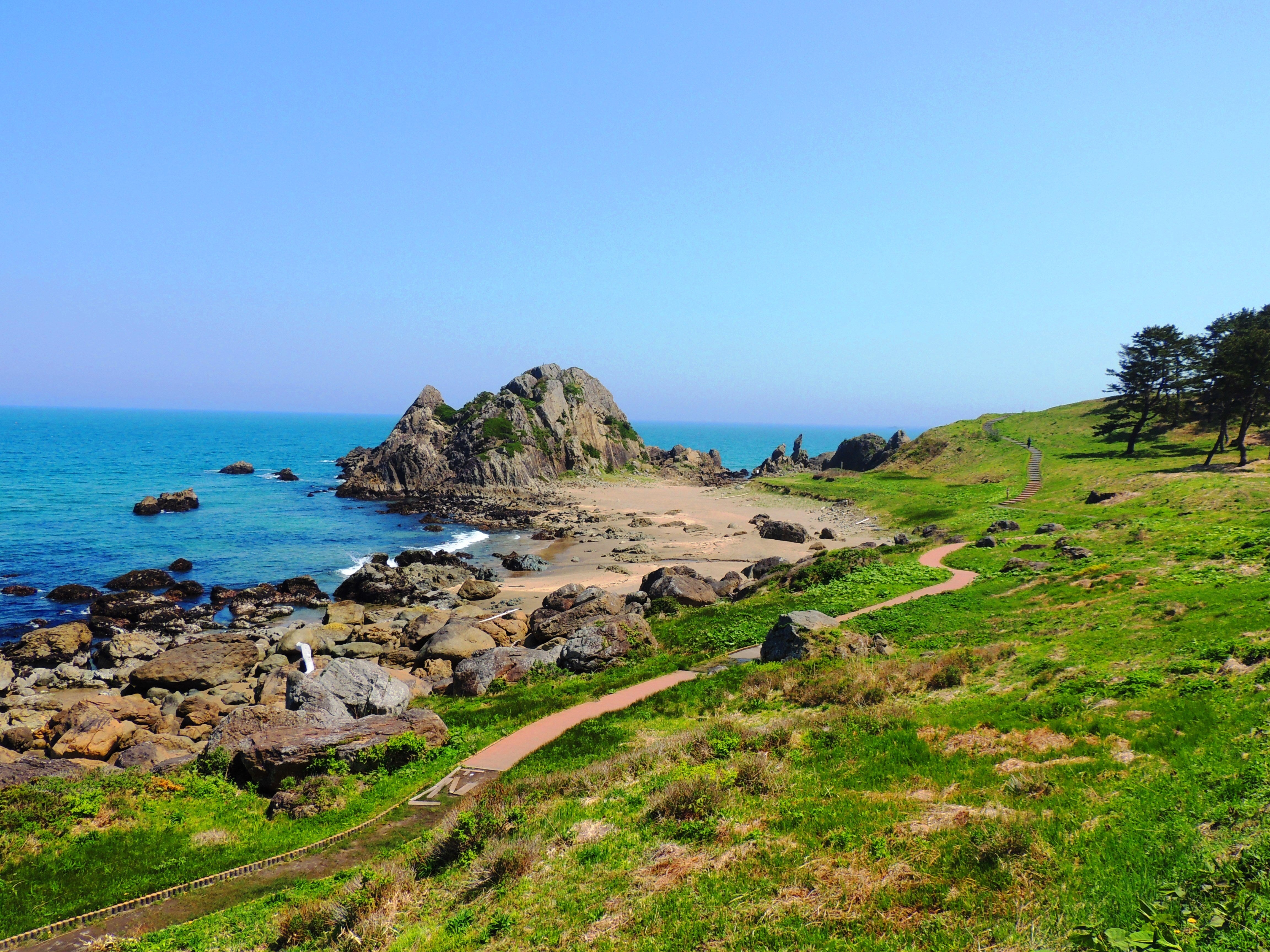 「三陸復興国立公園 」 蕪島と 葦毛崎展望台から種差海岸天然芝生地までの約5.2kmは、岩礁の海岸風景、真っ白な砂浜海岸、海浜植物と高山植物が隣り合わせるお花畑、松原と飽きの来ない風光明媚な景色が広がるため、ハイキングにもってこいです。日本の文豪たちがこよなく愛した渚の遊歩道で、日本の渚100選 にも選ばれています。