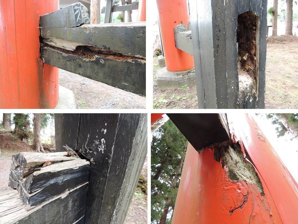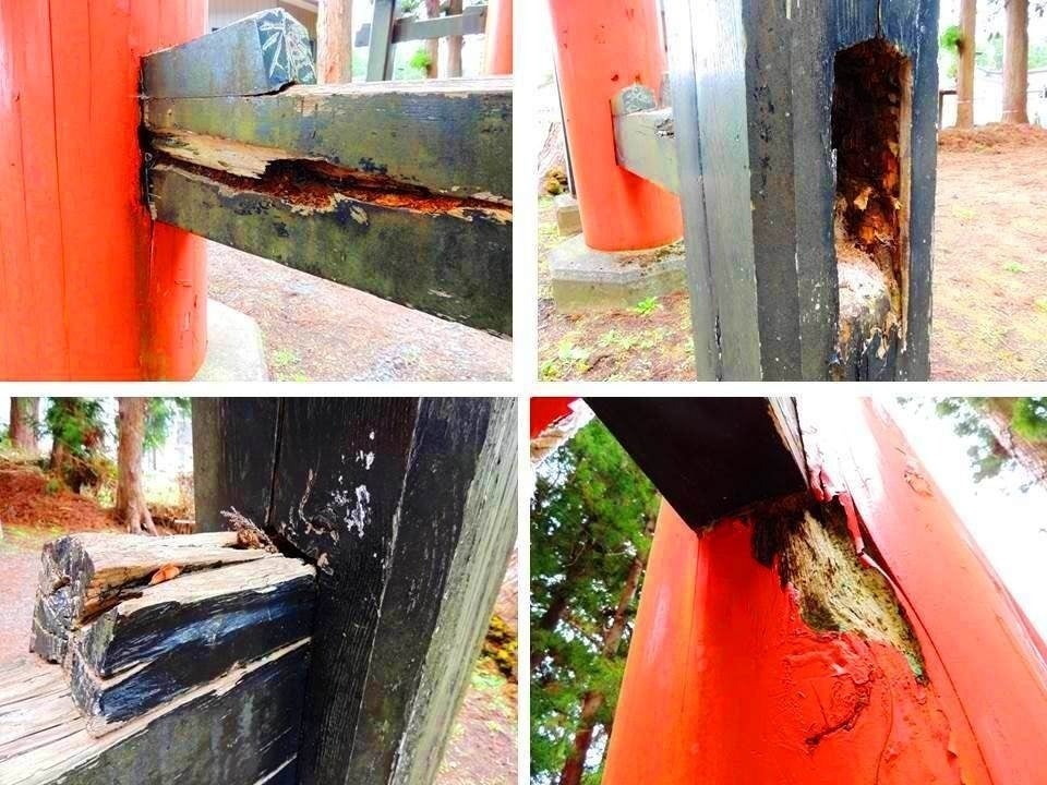 画像:老朽化した「希望の星大鳥居」の「控柱」と「梁」