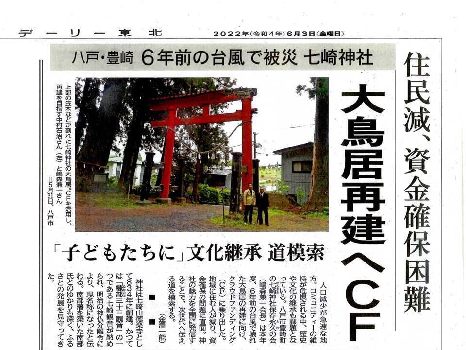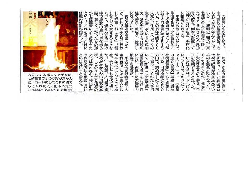 「なんとか復興し、神社を救いたい!”希望の星大鳥居”を再建し、コロナで苦しむ全国の皆様に”希望のひかり”を届けたい!」と願い、「七崎神社保存永久の会」を創設し「クラウドファンディング」に申し込んだ次第です。