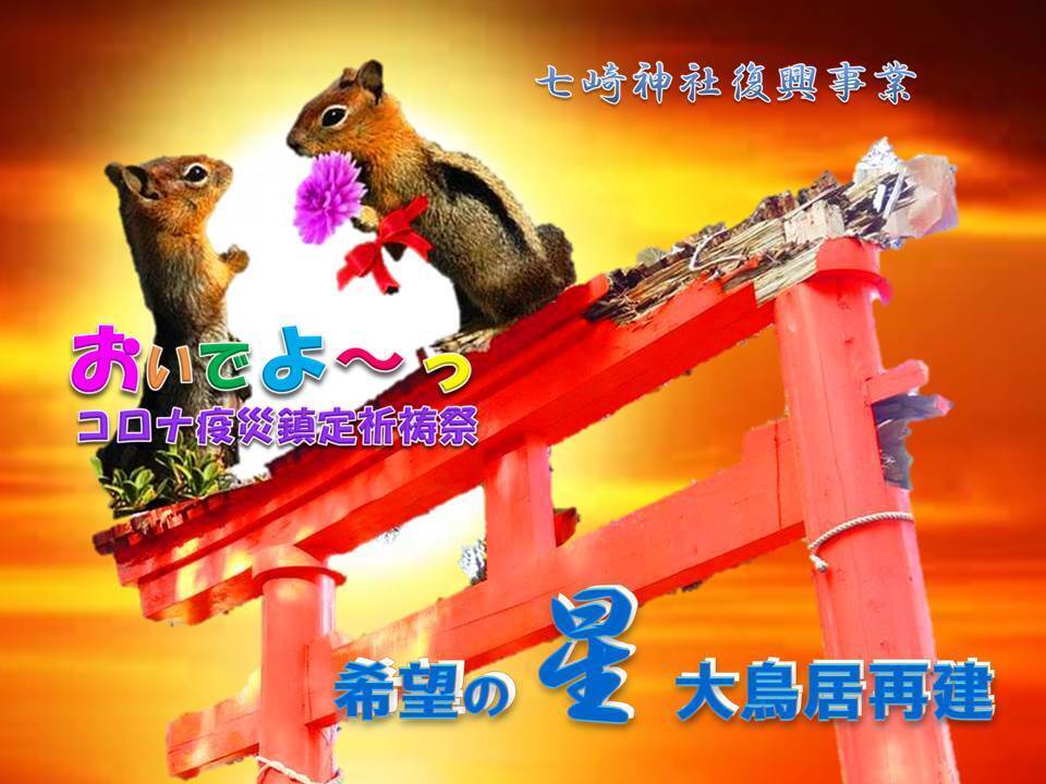 ※尚、 御支援頂いた全国の皆様に感謝を込めて、「本サイト」及び七崎神社 保存『永久の会』公式サイトを介して、「七崎神社コロナ疫災根絶(鎮定)全国祈祷大祭」 の模様や、「希望の星☆大鳥居」再建に挑む、宮大工”匠”たちの作業工程や完成画像など、公開させていただきます。