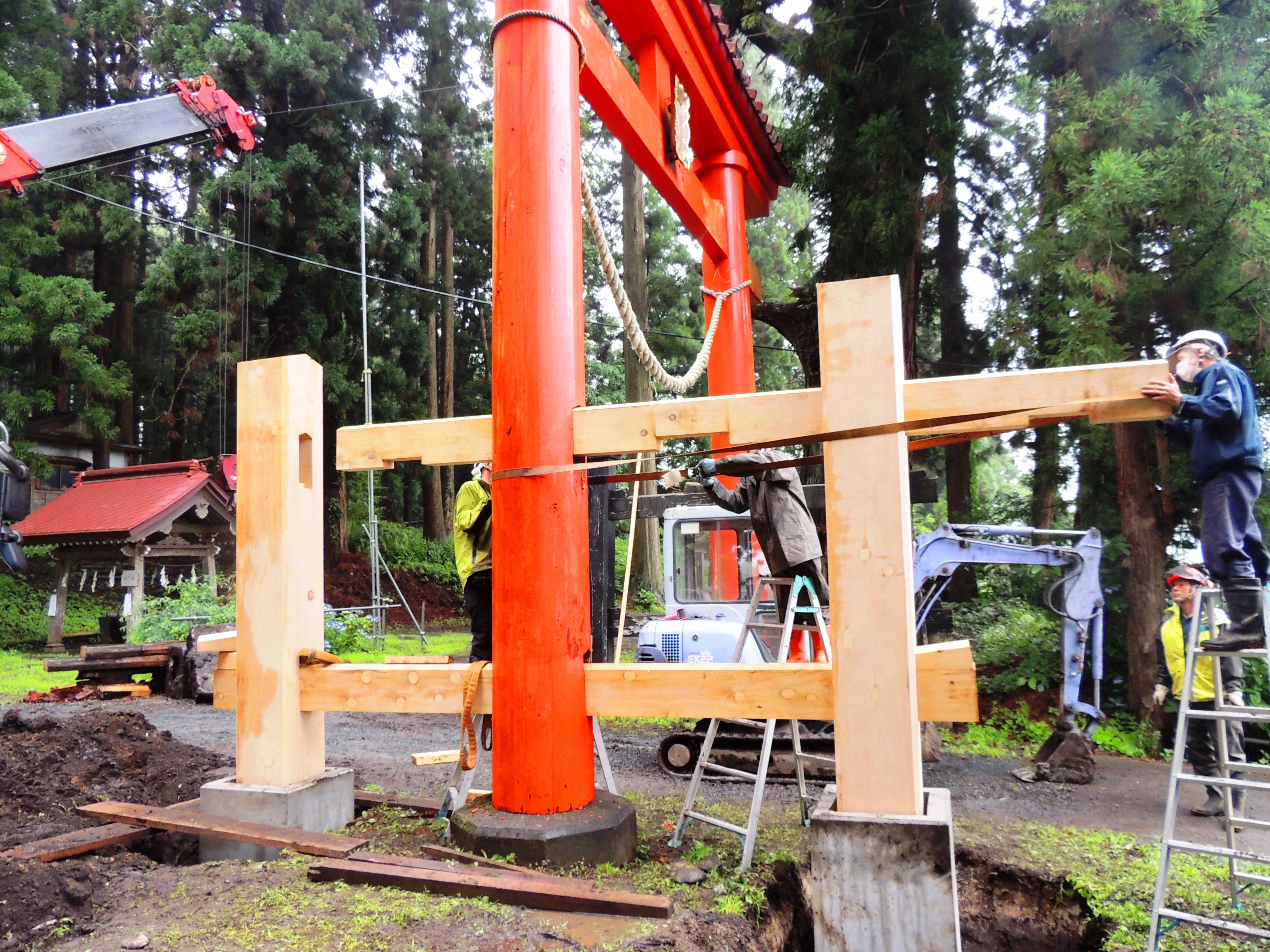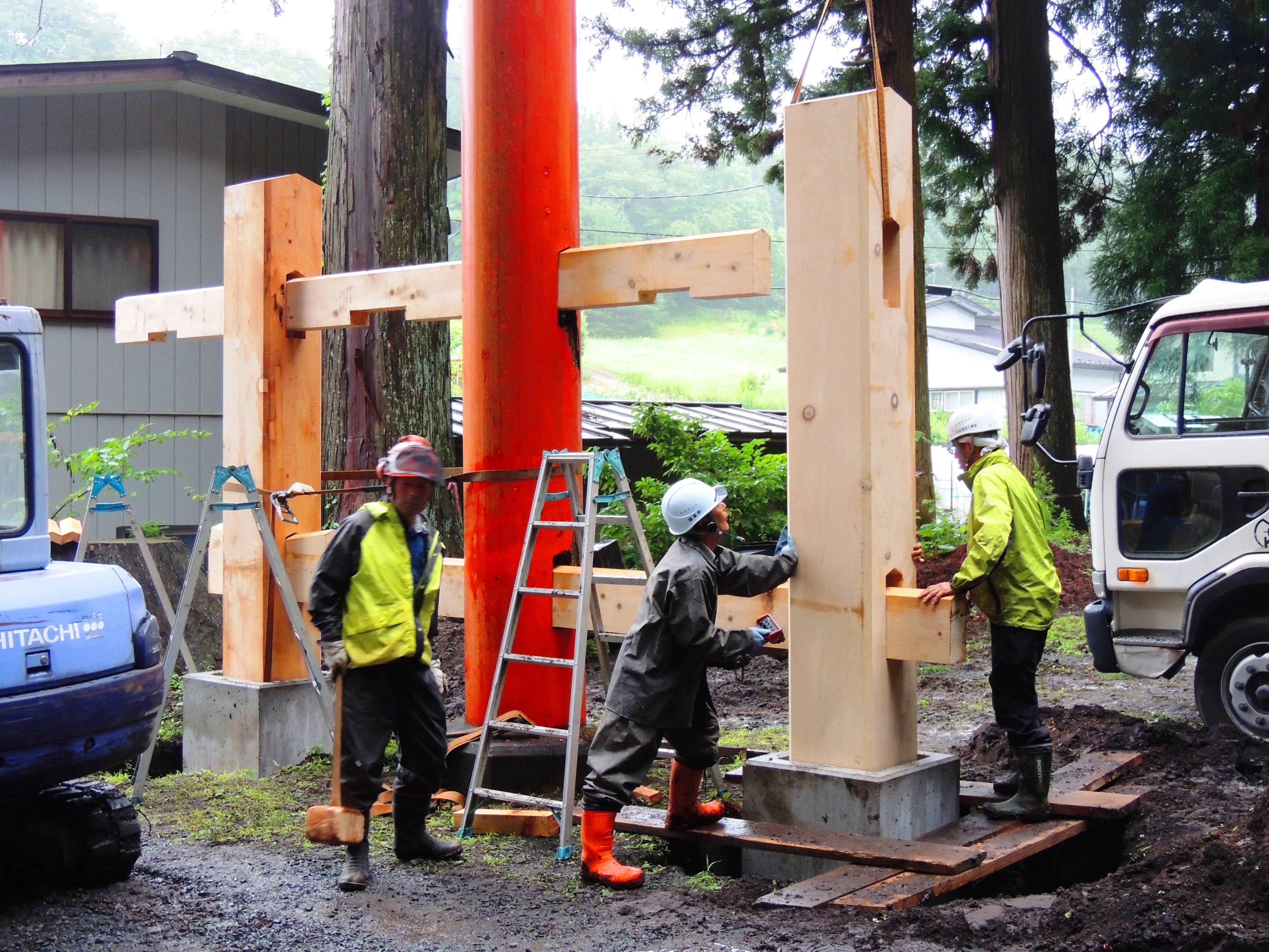 画像:完成はまだまだ先ですが片方の「控え柱と貫」の取り付けが無事にほぼ整いました。後はもう一方の「控え柱と貫」を取り付け、最後に「笠木と島木」を取り付けた後、両部鳥居の自重で下地が固まり落ち着いた頃にコンクリートを流し込む予定。