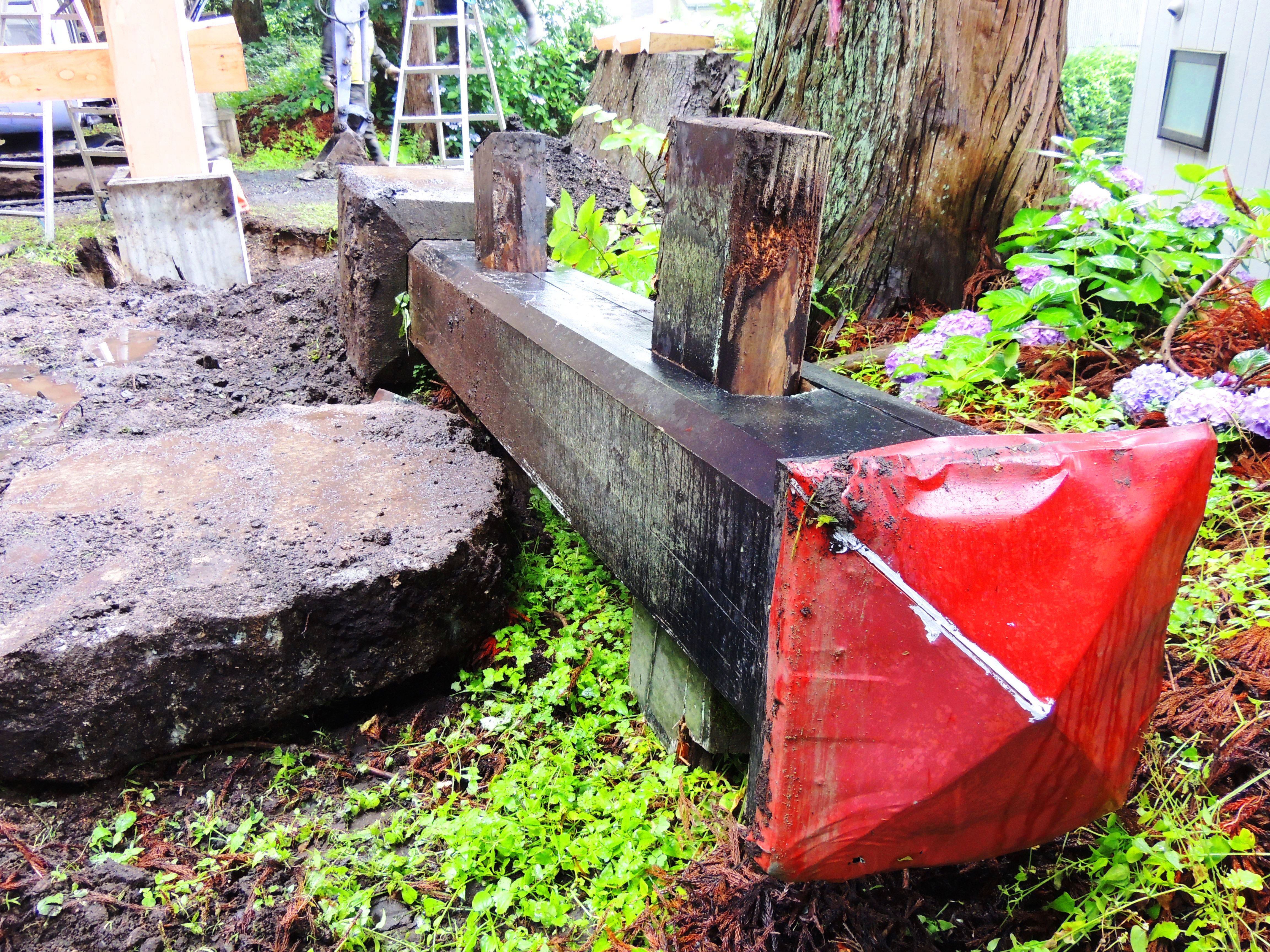 画像:小雨の中、宮大工の匠たちが片方の「控え柱と貫」の取り付け工事に汗を流した。 「控え柱」の「台石」の代わりにコンクリートの枠(約1m)を埋め込み、その枠の中に「控え柱」を置き最後にコンクリートで隙間を埋める方式を取っています。