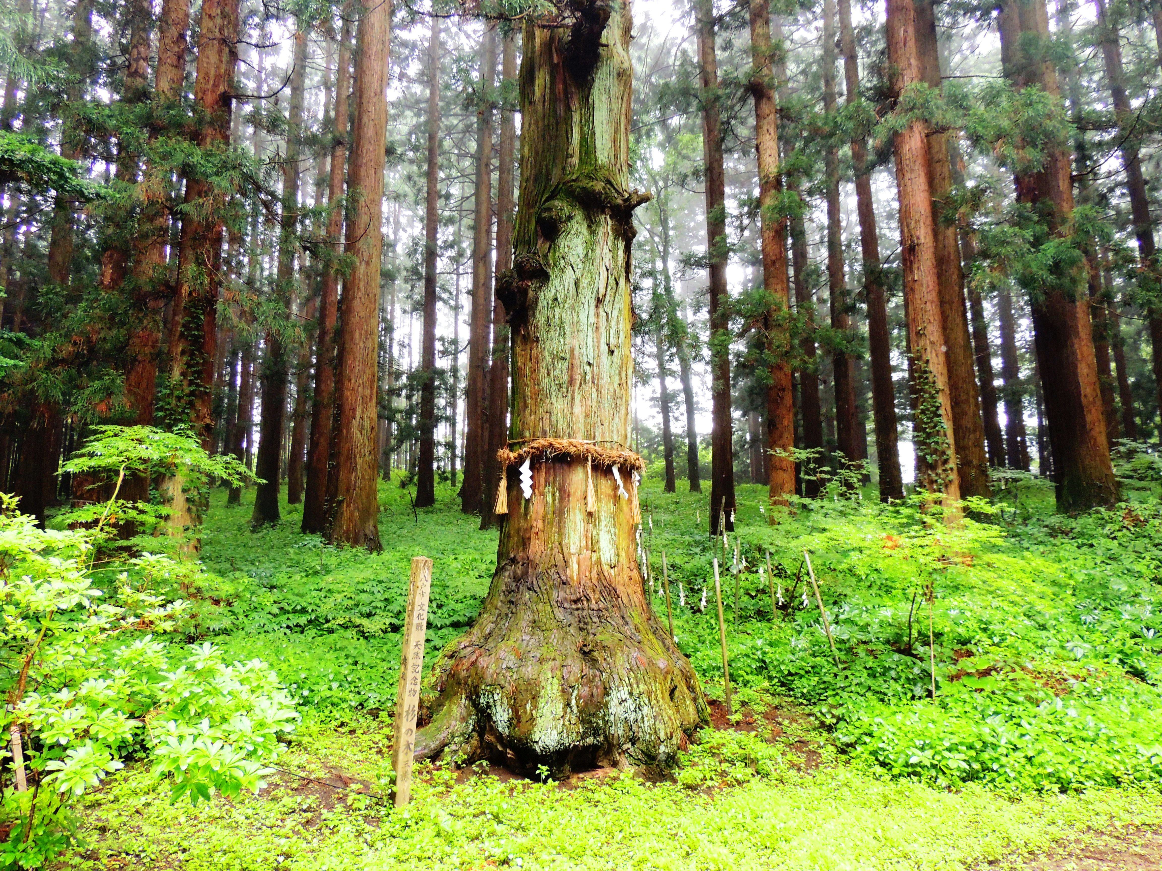背景にそびえる大杉が最も大きい推定樹齢一千有余年、樹高40mの 八戸指定文化財「北斗のほこすぎ(大杉)」です。創建834年に、平和を象徴する星座「北斗七星」を模り植えられた7本の内、3本が現在も「御神木のパワースポット鎮守の杜」の主として、生き続けています。神が宿り強運をもたらす!とされています。是非、一度「強運を授け富と福をもたらす七崎神社」へお越しください。静寂に包まれた別世界、鎮守の杜の多彩な御神木が皆様をお出迎え致します。