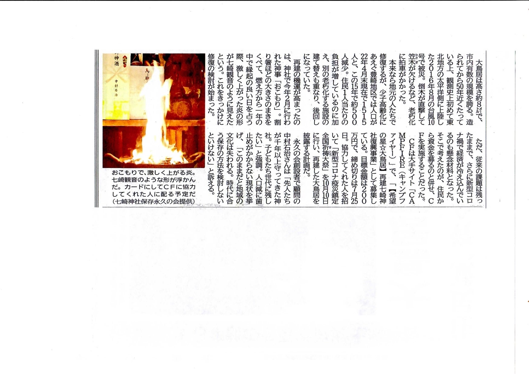 【希望の星☆大鳥居】再建に向けて「永久の会」スタッフの機運が高まったのは、令和4年2月7日に、七崎神社拝殿で執り行われた神事「おこもり」の際に、「神仏習合」当時から一千年以上に渡り、現在の七崎神社拝殿の位置にあった「七崎山徳楽寺聖観音菩薩本堂」(通称:七崎観音堂/様)ご本尊が、「炎と化し御神体を現わした!」ことで「御加護頂いていると確信!」したことによります。・・・南部藩主が奉納したご本尊の仏像と、全く、同じシェイプが燃え上がる炎と化し、出現したのです。