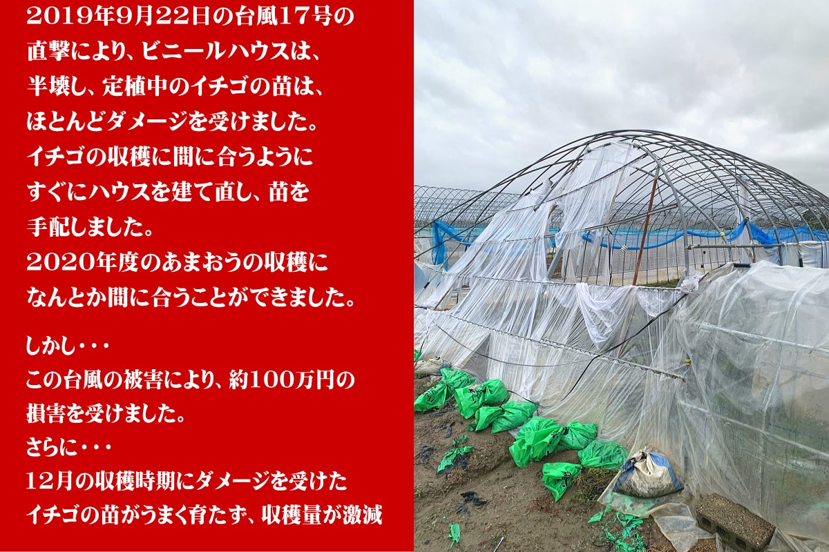 令和に入り、天災による施設被害や新型コロナウィルスによる突然の発注キャンセルなど、不運続きです。2019年5月の長雨に加え、9月の台風17号の被害を受け、例年の3分の1の収穫量に激減し、なんとか乗り越えたところに、令和2年(2020年)の新型コロナウィルスの影響により販売数の激減!