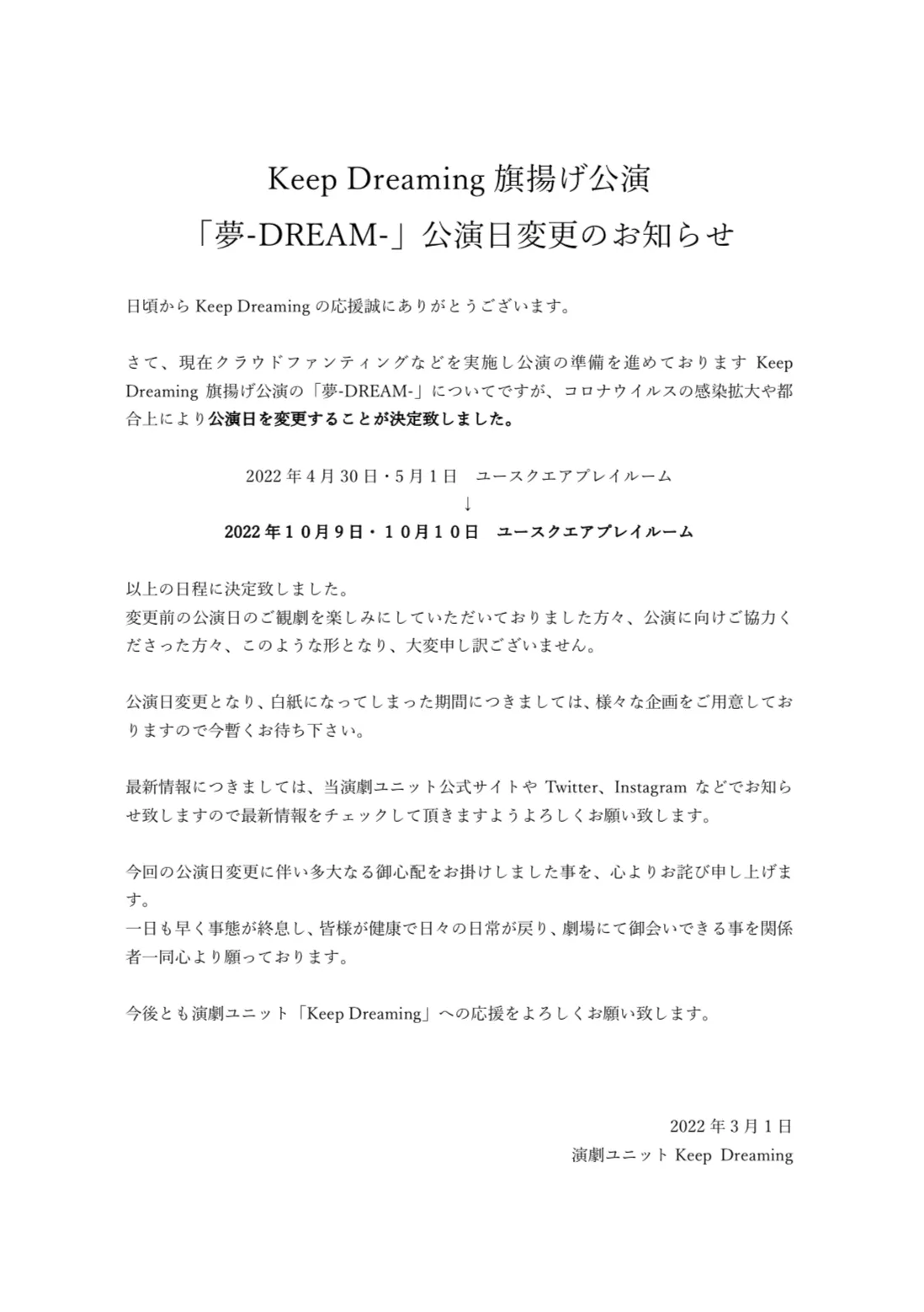 2022/03/19 07:00日頃からKeep Dreamingの応援誠に有難うございます。4月30日と5月1日に公演予定でした「夢-DREAM-」はコロナウイルスの影響や都合上により、公演日を変更することが決定致しました。このような流れになってしまい誠に申し訳ございません。変更になってしまった期間に、新しい企画も予定しておりますので楽しみに待っていてくださると幸いです。詳しくはホームページやSNSなどをご覧ください。今後ともKeepDreamingの応援よろしくお願い致しますKeepDreamingホームページhttps://theaterunitkeepdreaming.amebaownd.com/ もっと見る