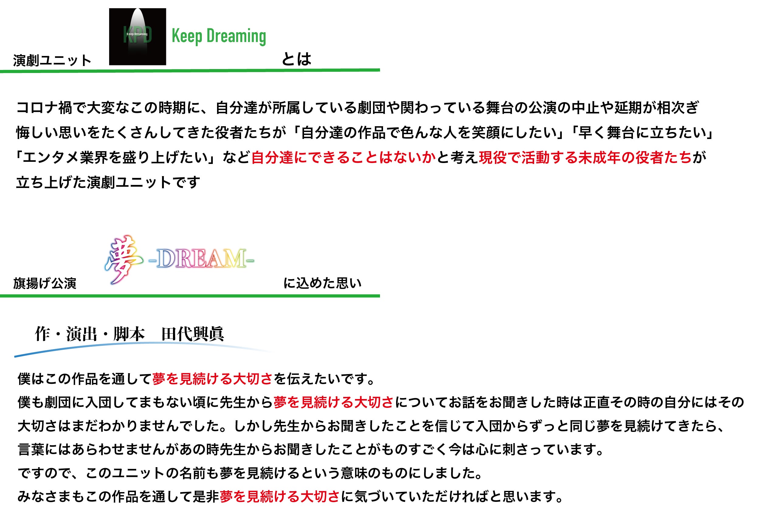 Keep Dreaming旗揚げ公演の「夢-DREAM-」は2年間「自分が伝えたいことは何か」と悩みに悩んで試行錯誤して完成した作品です。この作品は本当に色々な方を元気づける、そして夢を見続ける大切さを教えてくれる熱い作品です。