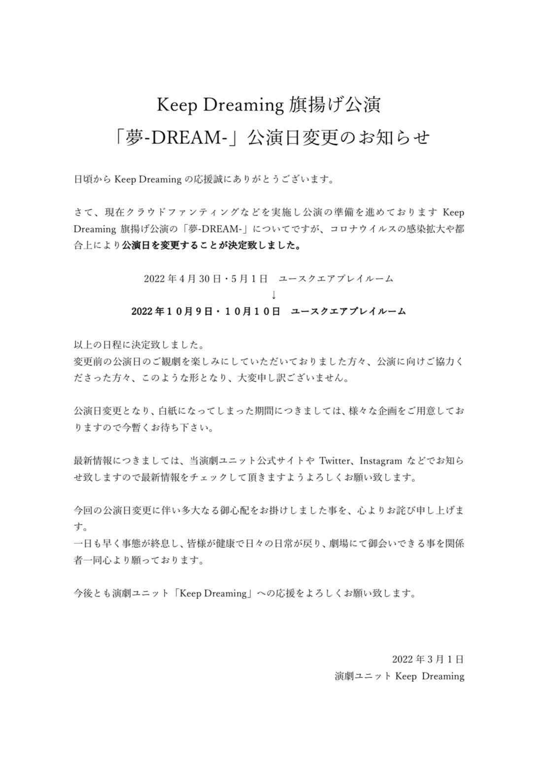 2022/03/19 07:00日頃からKeep Dreamingの応援誠に有難うございます。4月30日と5月1日に公演予定でした「夢-DREAM-」はコロナウイルスの影響や都合上により、公演日を変更することが決定致しました。このような流れになってしまい誠に申し訳ございません。変更になってしまった期間に、新しい企画も予定しておりますので楽しみに待っていてくださると幸いです。詳しくはホームページやSNSなどをご覧ください。今後ともKeepDreamingの応援よろしくお願い致しますKeepDreamingホームページhttps://theaterunitkeepdreaming.amebaownd.com/ もっと見る
