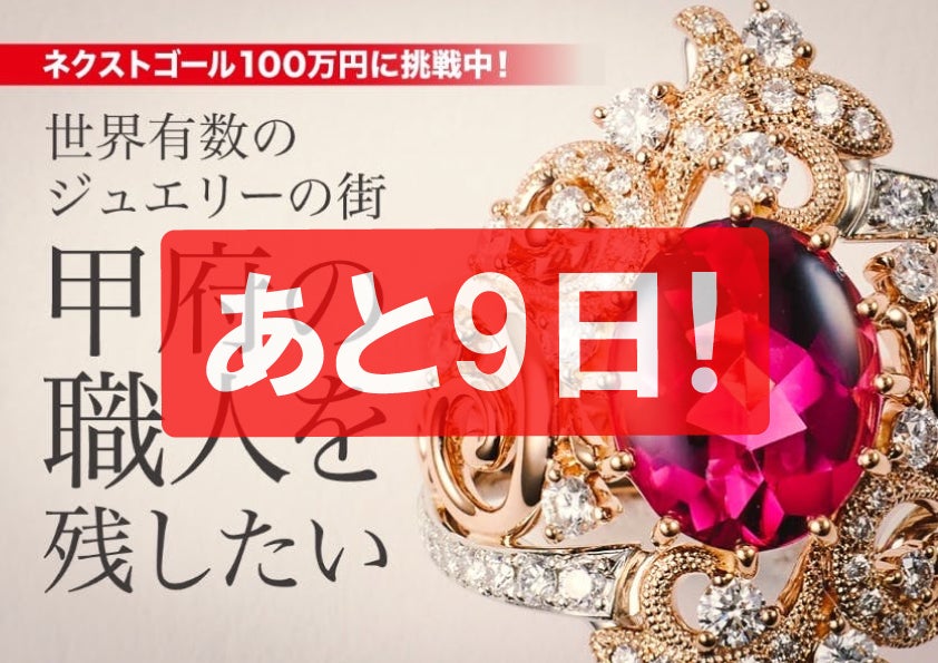 B.L.S.です!Campfireクラウドファンディング「宝石の街・甲府の職人を残したい!【甲府宝飾協会】を立ち上げます」プロジェクト終了まで、残すところあと9日となりました!!!これまでに御支援や応援コメントを頂きました皆さまに感謝を申し上げます。また、当プロジェクトをご覧頂きました皆さまにも感謝致します。残りの時間を大切に頑張って活動して参りますので、プロジェクト終了まで応援を宜しくお願い致します!