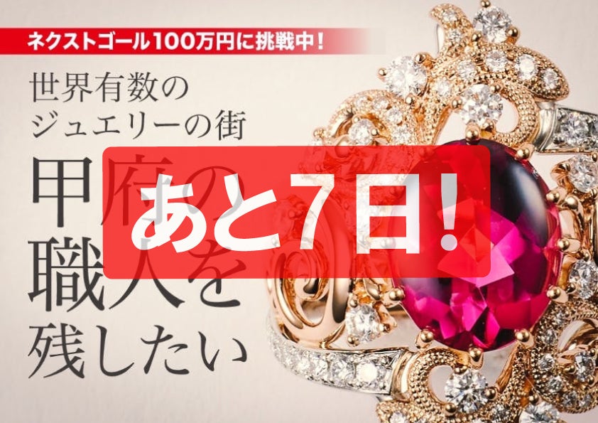 B.L.S.です!Campfireクラウドファンディング「宝石の街・甲府の職人を残したい!【甲府宝飾協会】を立ち上げます」プロジェクト終了まで、残すところあと7日となりました!!!これまでに御支援や応援コメントを頂きました皆さまに感謝を申し上げます。また、当プロジェクトをご覧頂きました皆さまにも感謝致します。残りの時間を大切に頑張って活動して参りますので、プロジェクト終了まで応援を宜しくお願い致します!