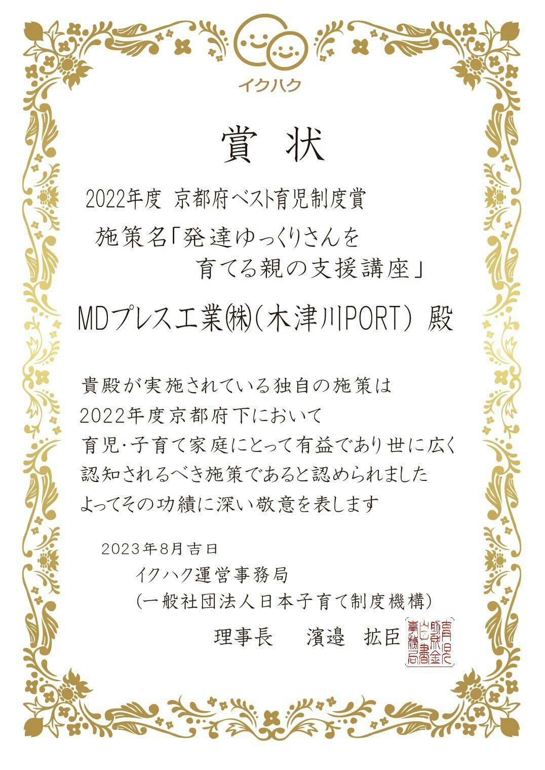 2023/08/22 21:47昨年度皆様のご支援をいただき1年間公約通り開催させていただきました取り組みが「2022年度ベスト育児制度賞」の京都府代表に選ばれました。今回の受賞した背景といたしまして、普通の中小企業の中において発達支援や多様性を受け入れ働きやすい環境を作ることにつながるであろう講座を開講するに至った社内制度(体制)に関して大きく評価されたとのことです。この取り組みがきっかけとなり、多様性のある誰もが働きやすい職場づくりにつながっていくことを改めて祈っております。ご支援いただきましたことを改めてお礼申し上げます。詳しくは下記のイクハクさんのHPでご覧いただけます。イクハク2022年度受賞制度一覧なお、2023年度の取り組みは木津川PORTを飛び出し、新たな体制でスタートしております。9月10日には第二回の講座が開催されます。詳しくは上記チラシの連絡先へお問い合わせください。今後もご支援の程よろしくお願いいたします。 もっと見る