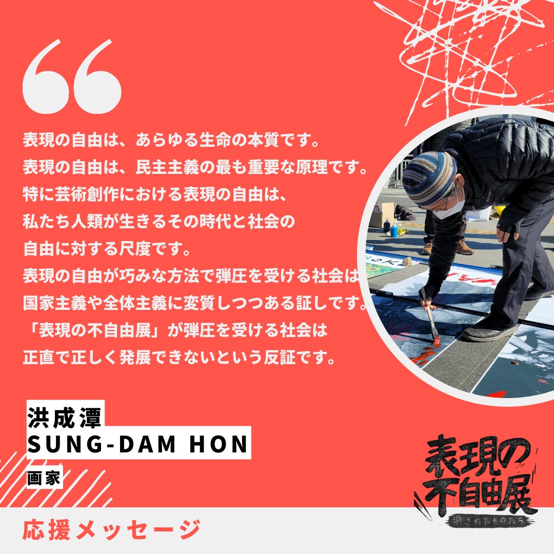画家の洪成潭さんから応援メッセージが届きました!引き続き、拡散&支援のご協力をよろしくお願いいたします!#表現の不自由展 #クラファン挑戦中 #表現の自由 #美術 #芸術 #平和の少女像 #展覧会 #社会運動 #民主主義