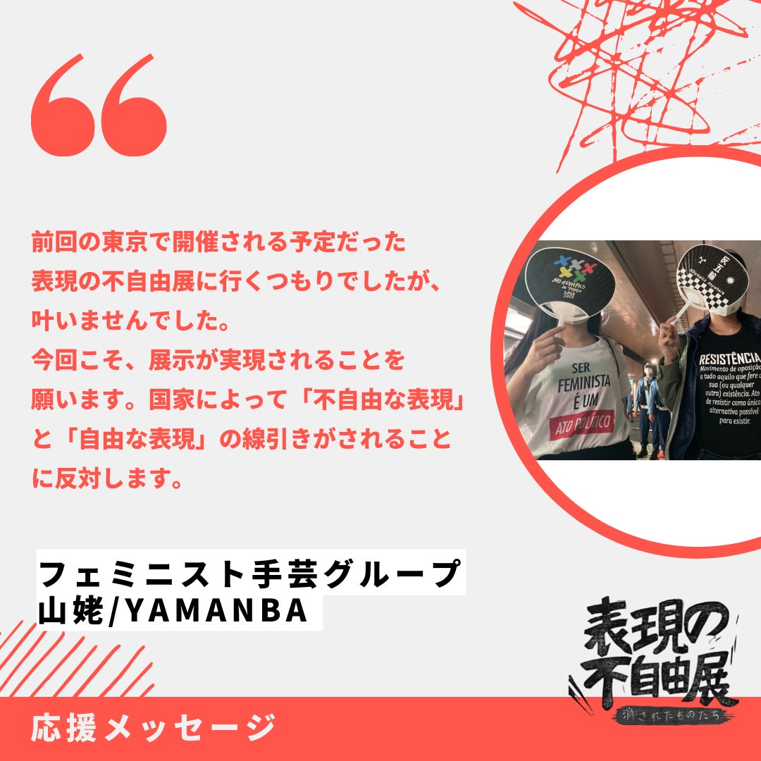 「山姥」さん(フェミニスト手芸グループ)より、応援メッセージが届きました!拡散&支援のご協力をよろしくお願いいたします!#表現の不自由展 #クラファン挑戦中 #表現の自由 #美術 #芸術 #平和の少女像 #展覧会 #社会運動 #民主主義