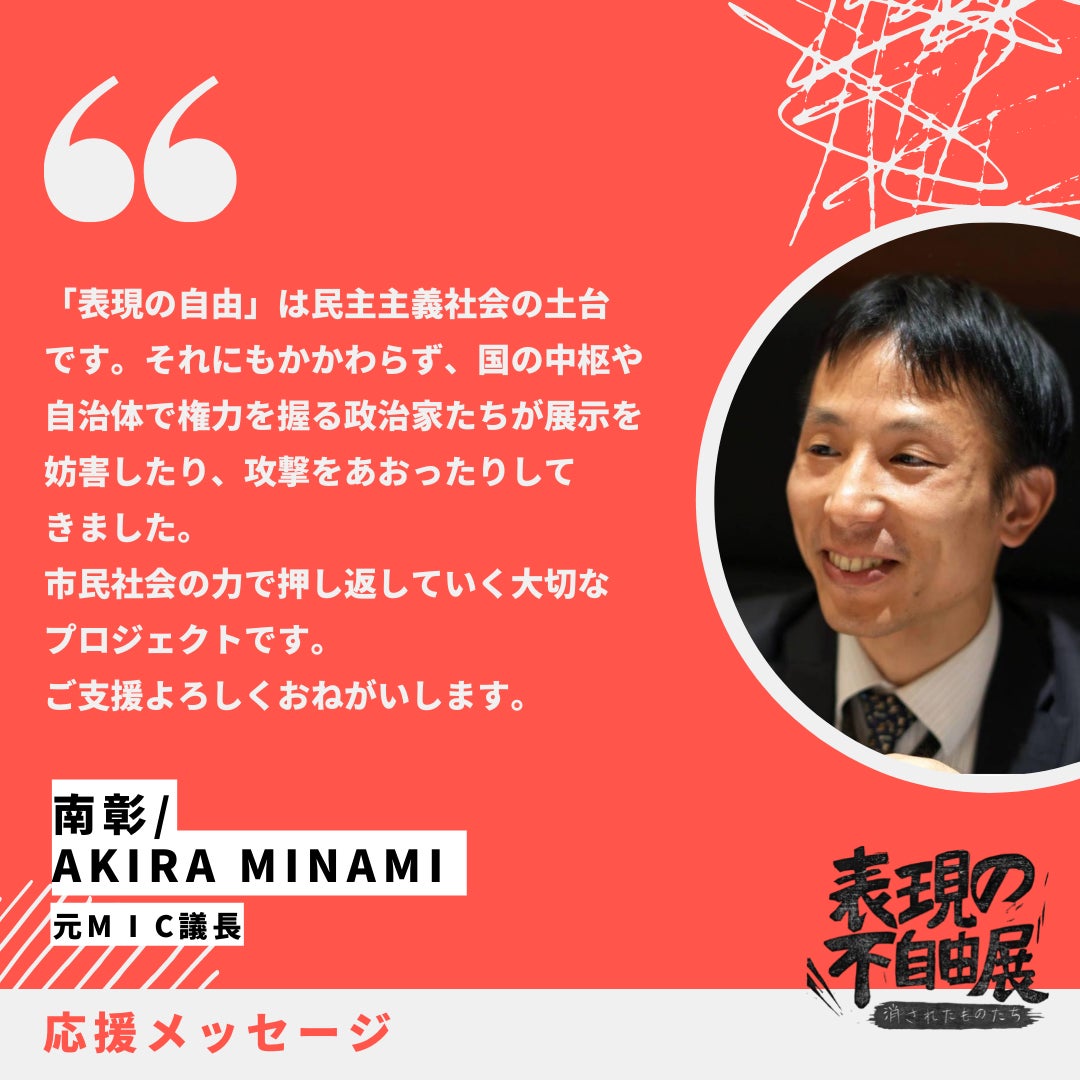 【元MIC議長】の南彰さんから応援メッセージが届きました!引き続き、拡散&支援のご協力をよろしくお願いいたします!#表現の不自由展 #クラファン挑戦中 #表現の自由 #美術 #芸術 #平和の少女像 #展覧会 #社会運動 #民主主義