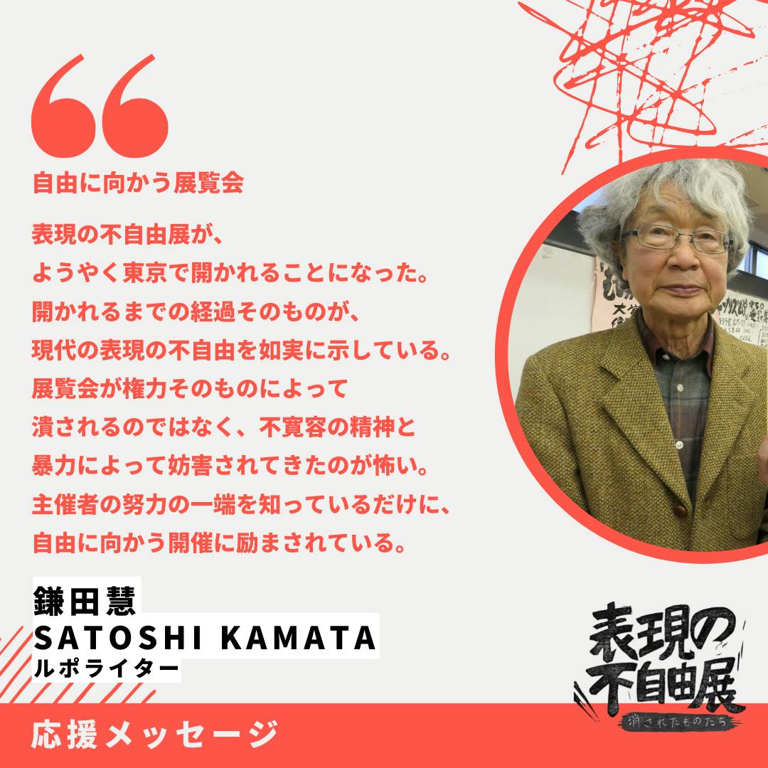 鎌田慧さん(ルポライター)より、応援メッセージが届きました!拡散&支援のご協力をよろしくお願いいたします!#表現の不自由展 #クラファン挑戦中 #表現の自由 #美術 #芸術 #平和の少女像 #展覧会 #社会運動 #民主主義