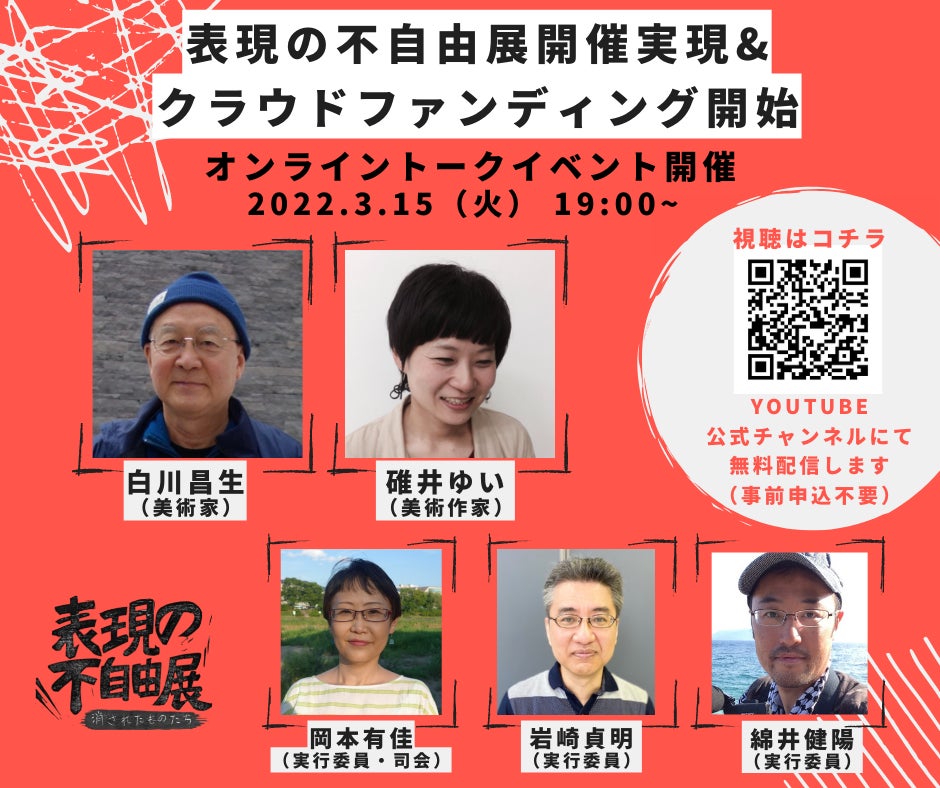 \オンラインイベント開催します/不自由展の実現に向けて、「表現の不自由展」出展作家、「あいちトリエンナーレ」出品作家、そして実行委員のメンバーが想いを語ります!イベント概要日時:3月15日 19:00~配信:YouTube無料配信◯事前申込不要!お気軽にご参加ください。出演ゲスト:白川昌生、碓井ゆい出演実行委員:岡本有佳(司会)、岩崎貞明、綿井健陽▼配信は不自由展公式YouTubeチャンネルからhttps://youtube.com/channel/UCEbv7NnzXcrSqhaUjM6o09Q