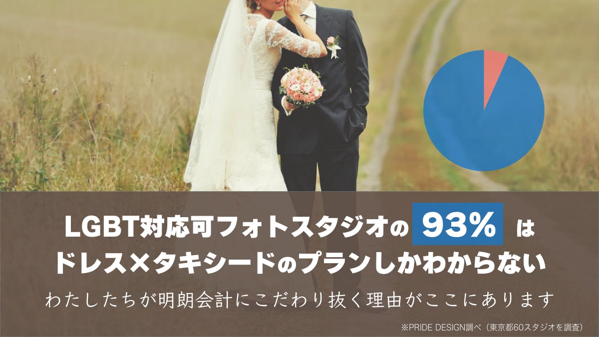 LGBT対応可と記載されていた東京都の60ものフォトスタジオを調査した結果、93%のスタジオはインターネット上ではドレス×タキシードの金額しかわかりませんでした(2022年4月13日時点)。