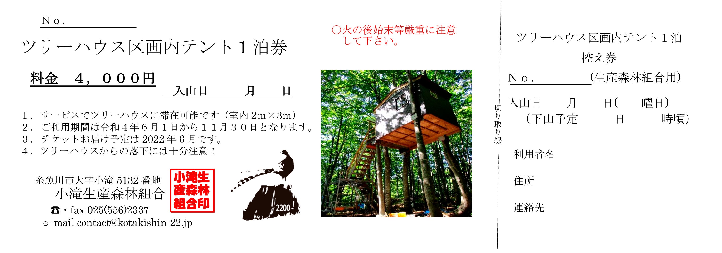 【ツリーハウス区画内テント1泊券(見本)】