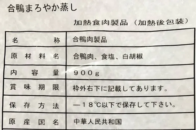 原材料:合鴨ロース肉、塩・胡椒(1%)
