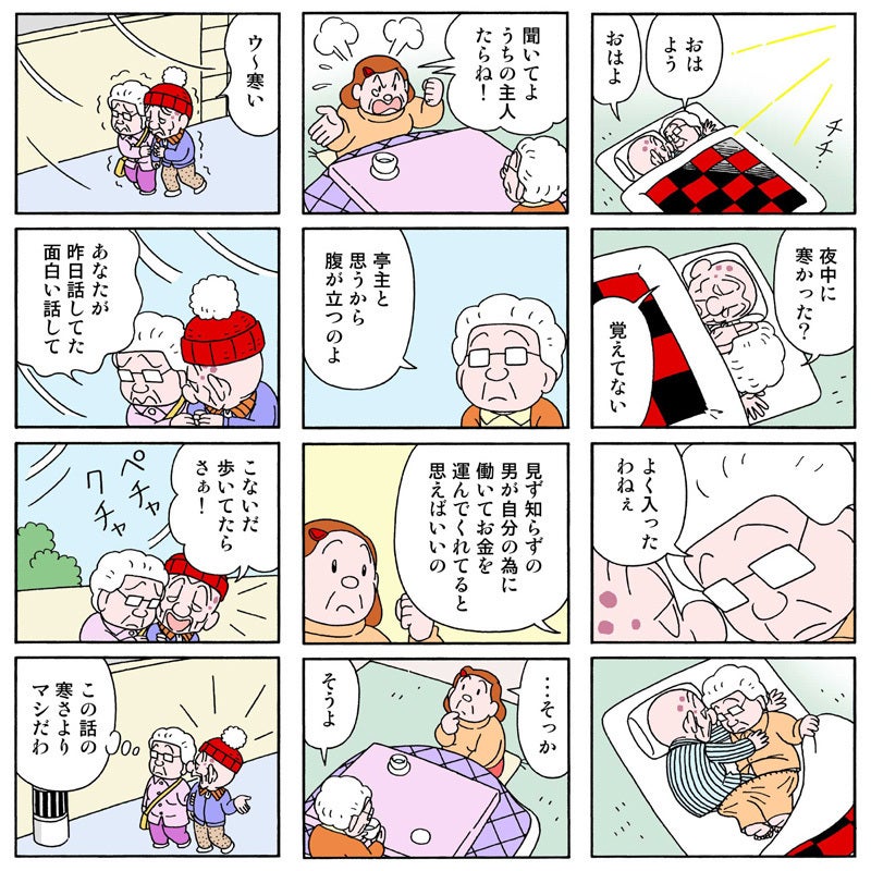 仲むつまじい老夫婦と、2人を取り巻く高齢者仲間やその家族らの日常をユーモアたっぷりに描いた作品です。高齢の田中徳男と、妻・春子が主人公。ほのぼのとした日々の暮らしをはじめ認知症や終活、入院生活など高齢者が直面する問題まで、さまざまなテーマを取り上げています。