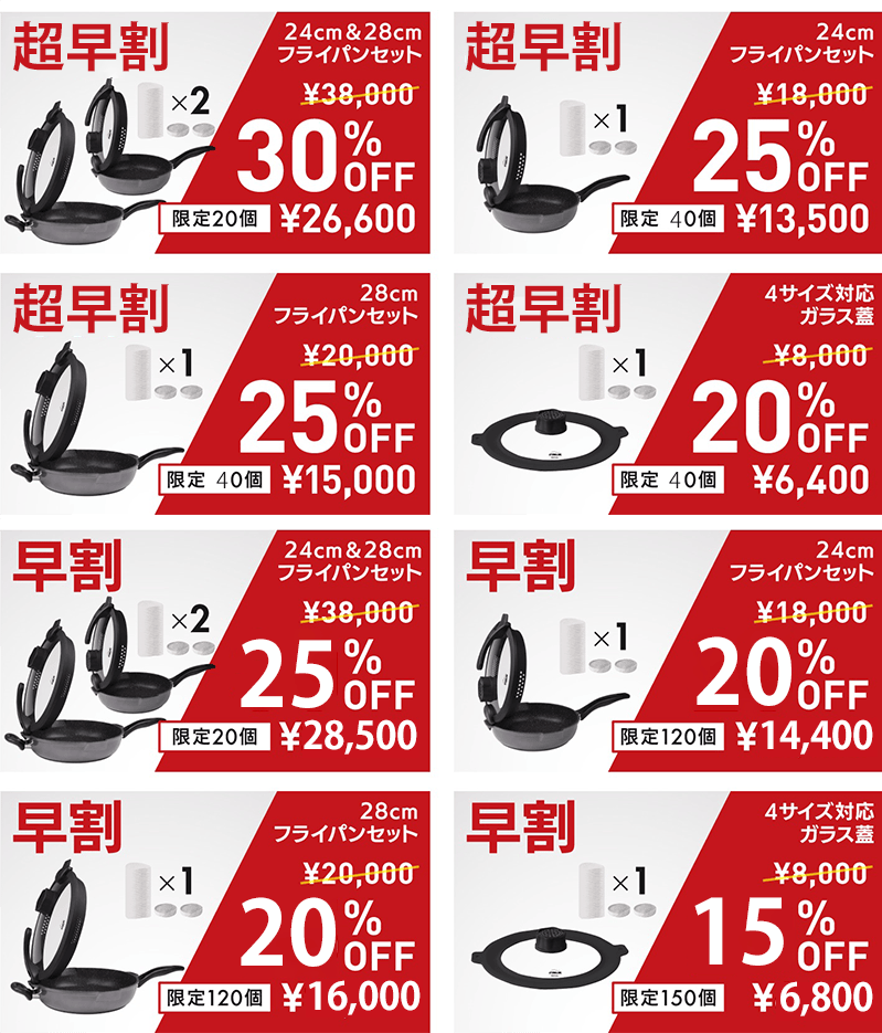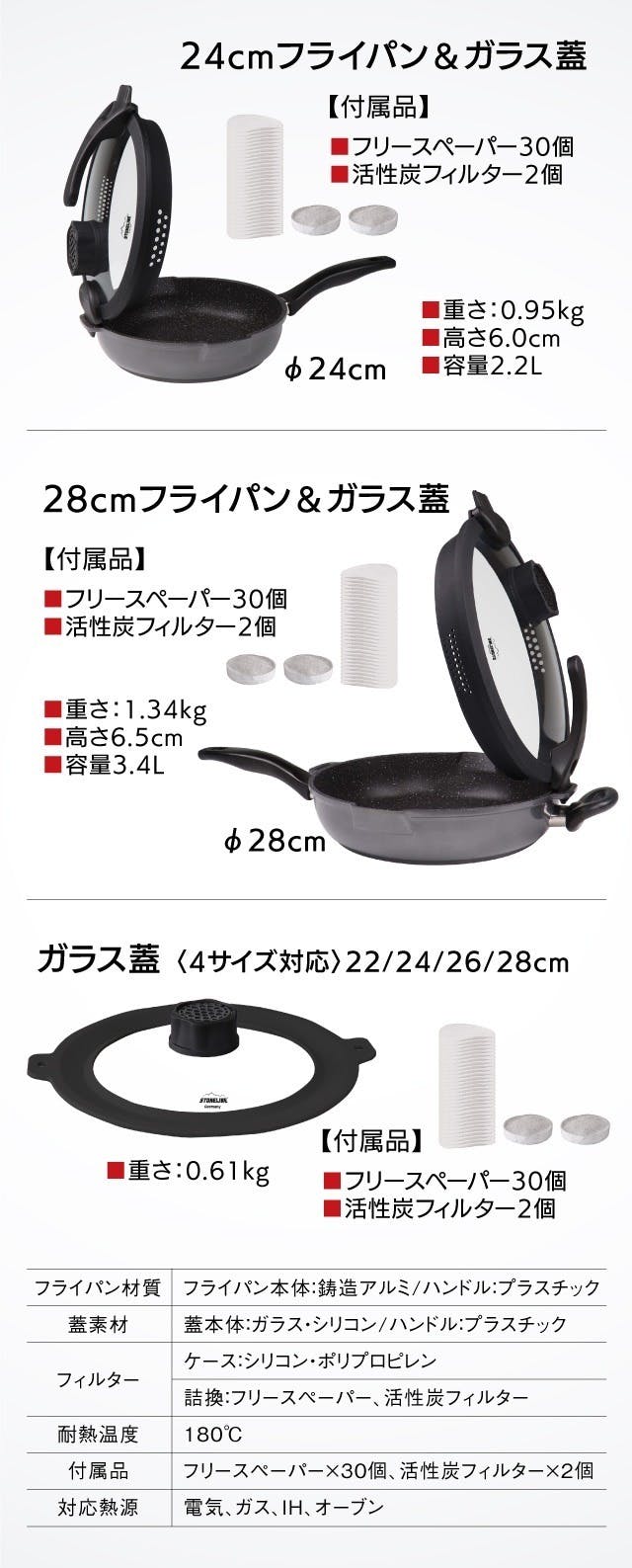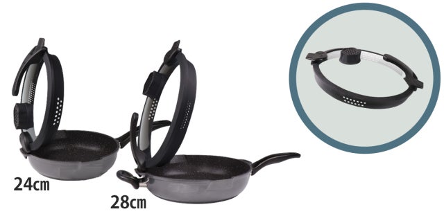 24㎝フライパンセットと28㎝フライパンセットは、それぞれのフライパン専用のフタがついています。