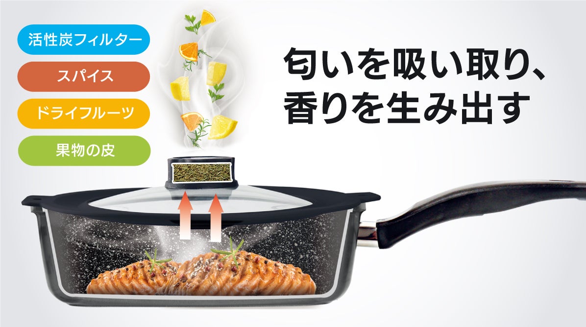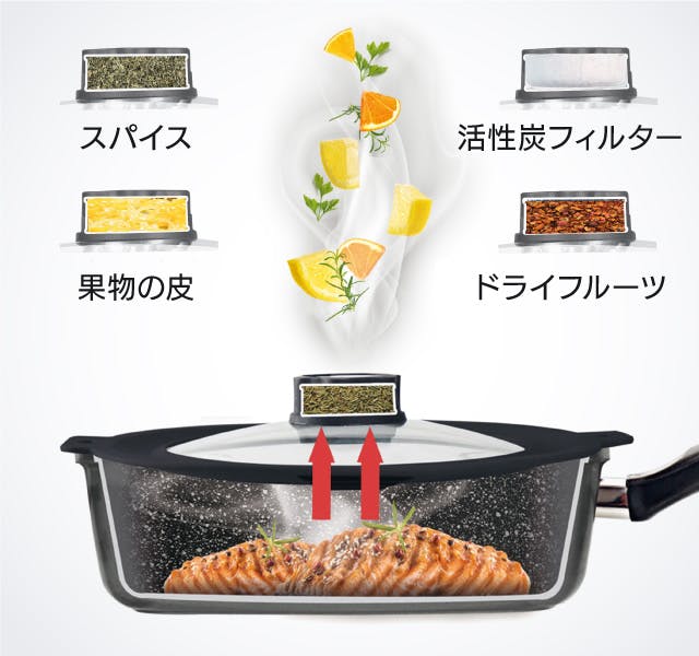 A.蒸気の力で発生する香りですので、基本的には上に向かって放出されます。柑橘類など水分を含む素材をご利用されると、料理に香りが移る可能性がありますが、料理によっては美味しさが広がります。