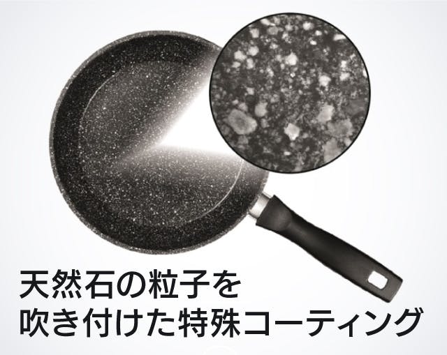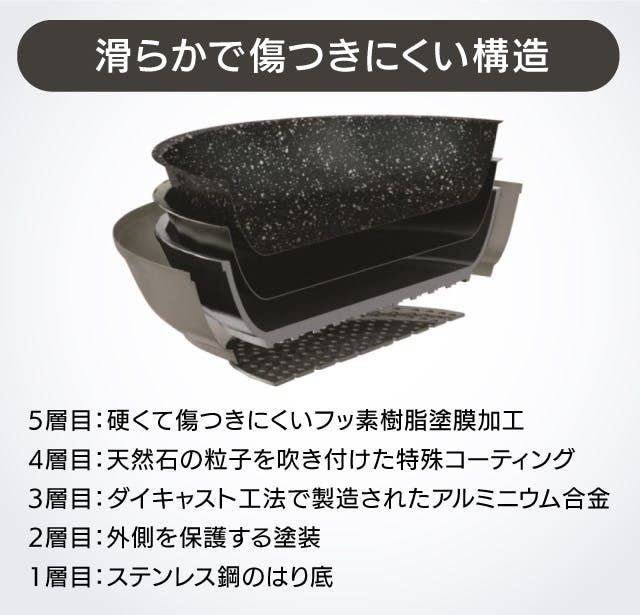 本体は、熱伝導率が良いとされるアルミニウム合金(はり底はステンレス鋼)で製造されており、内側には石の粒子を吹き付けた特殊コーティングが施されています。