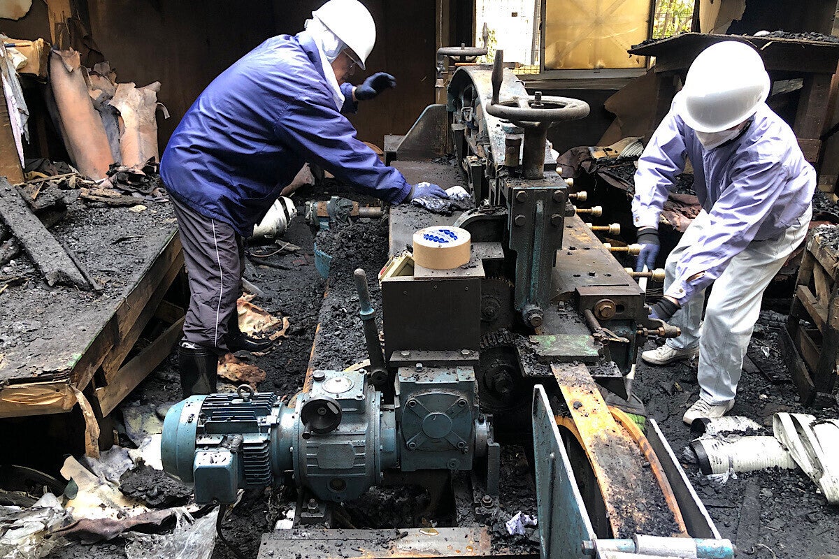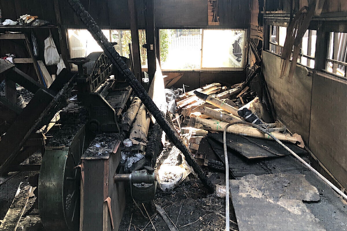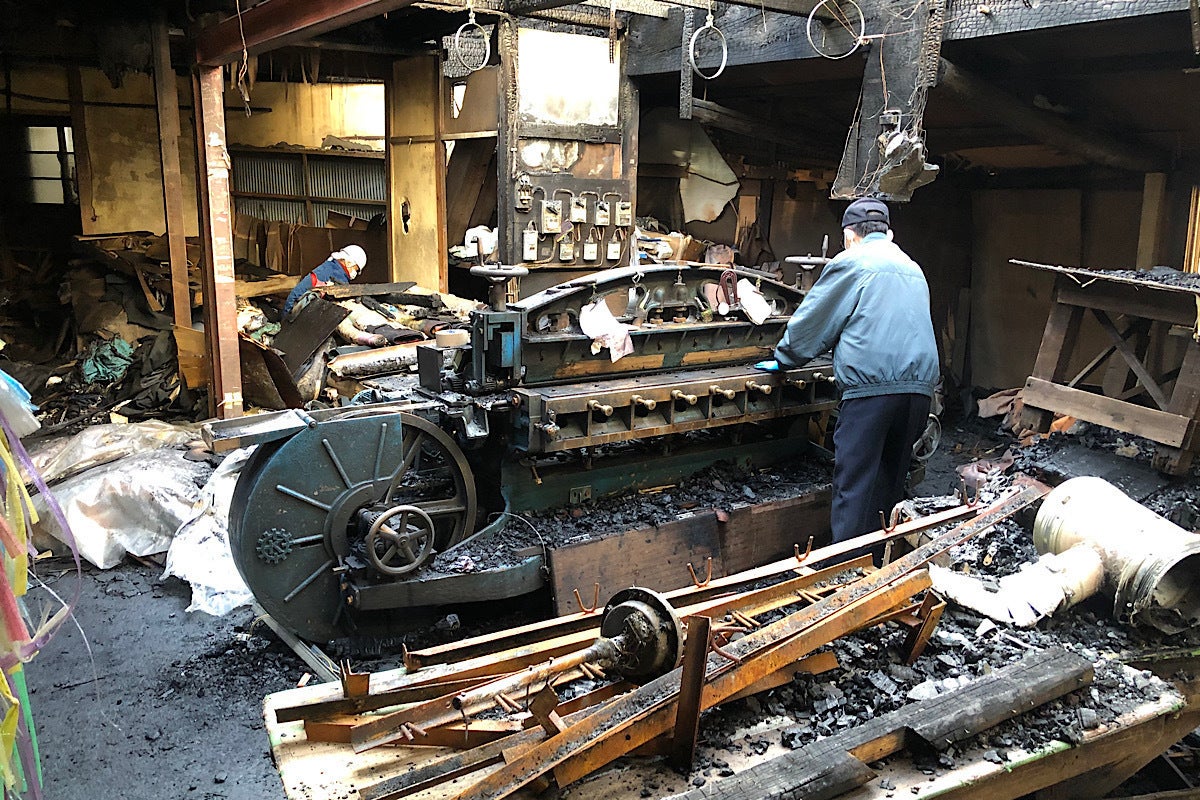 工場内は焼け残ったおかげで漉き加工の機械は無事です、もしこの機械が燃えてしまっていたら再建は出来ず廃業を選んでいたと思います。近隣に延焼しないように消防の方に頑張ってもらいましたが、放水の水は工場内に落ち、モーターの部分がダメになっているかもしれません。今は電気を止めているため、確認することが出来ず機械が動くかどうかはまだ不明ではありますが、もしかしたら、修理をすることでまた使える可能性があります。漉きの機械は現存しているものしかなく、もう同じ機械を購入することが出来ないのです。