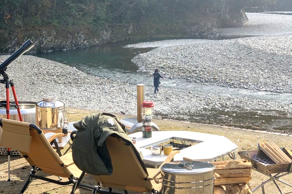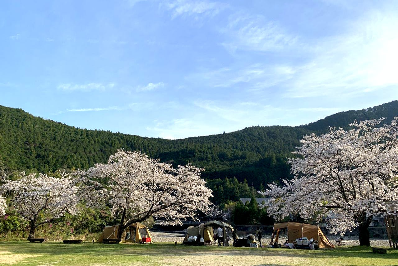 川のほとりのテントサイトは春には桜が咲き誇り、秋は紅葉も鮮やかに。夏は川遊びも楽しめ、四季を通して運がよければ朝霧のたなびく川や、満天の星空に天の川を見ることができる美しい場所です。