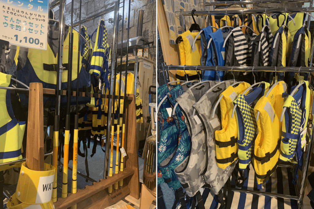 また、このあたりは鮎やアマゴが釣れるため、通常鑑札(遊魚券)がなければ川に入れないのですが、地元の川を管理している漁協さんに直接かけあって実現したオリジナル川魚用釣竿セットのレンタル! これで狙うのはウグイやオイカワなど。竿と餌になる魚肉ソーセージ、許可を得ている証明となる腕章がセットです。