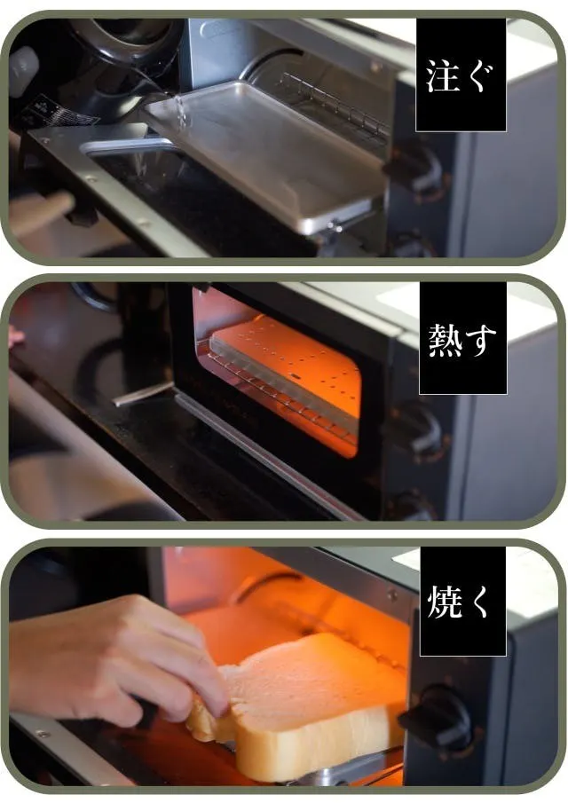 使い方はすごくシンプル。プレートに水を注ぎ、そのまま焼くだけ。