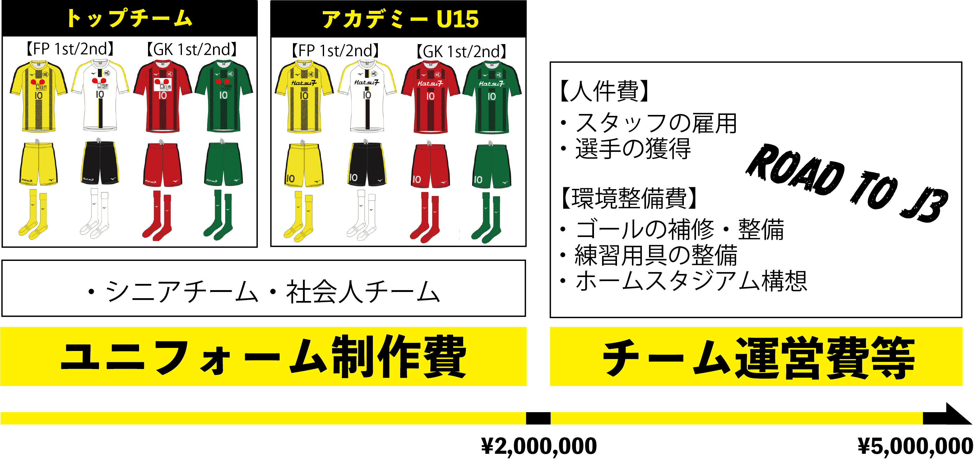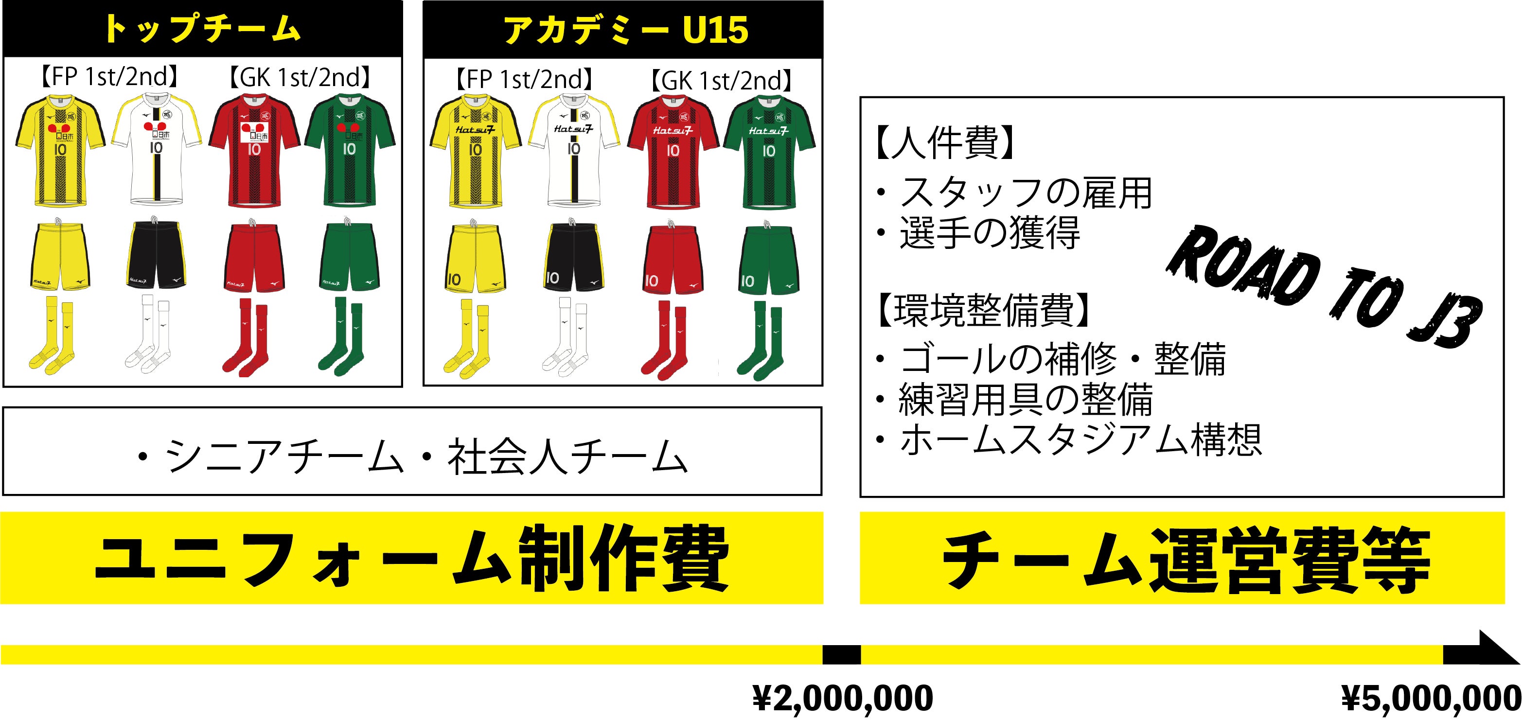 日頃よりクラブを支えてくれている多くのサポーター様、また一人でも多くの皆様の力をお貸しいただきき、皆様と共にクラブを発展させていきたいという願いを込め、ユニフォーム変更費用を今回のプロジェクトで募りたいと考えます。
