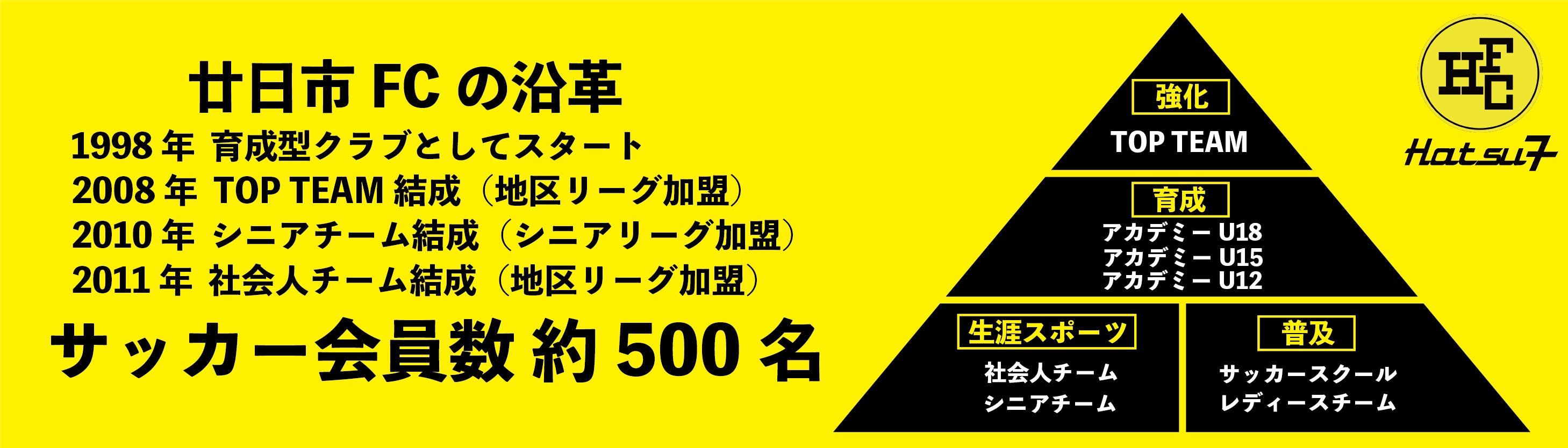 クラブのシンボルチームである廿日市FCトップチームは「育成年代の選手たちが目指す場所にしたい」、「OBの選手たちが帰ってこれる場所にしたい」、「サッカーを通じて廿日市のまちとひとを盛り上げたい」というクラブの想いから、2008年よりJリーグへの参入を目指してスタートしました。