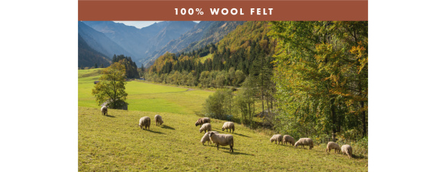 汚れにくく、柔らかく、手触りのいい天然のメリノウールフェルトはしわになりにくく、伸びたり、糸くずが出たりすることもありません。