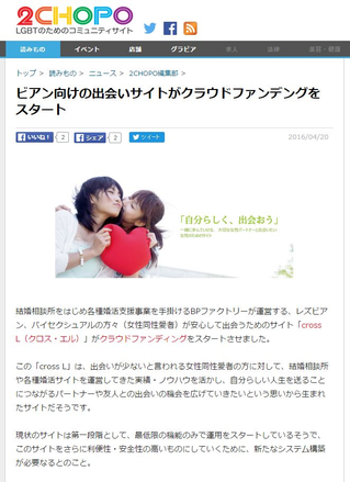 LGBTのためのコミュ二ティサイト『2CHOPO』に取り上げていただきました。