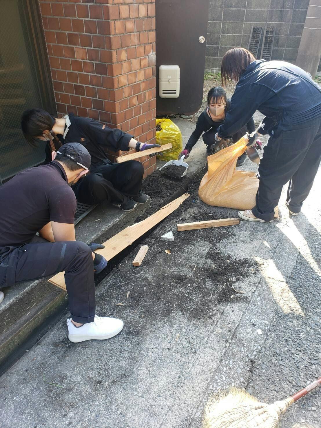 カフェのスタッフ+助っ人はみんな、つなぎを来て清掃活動してました