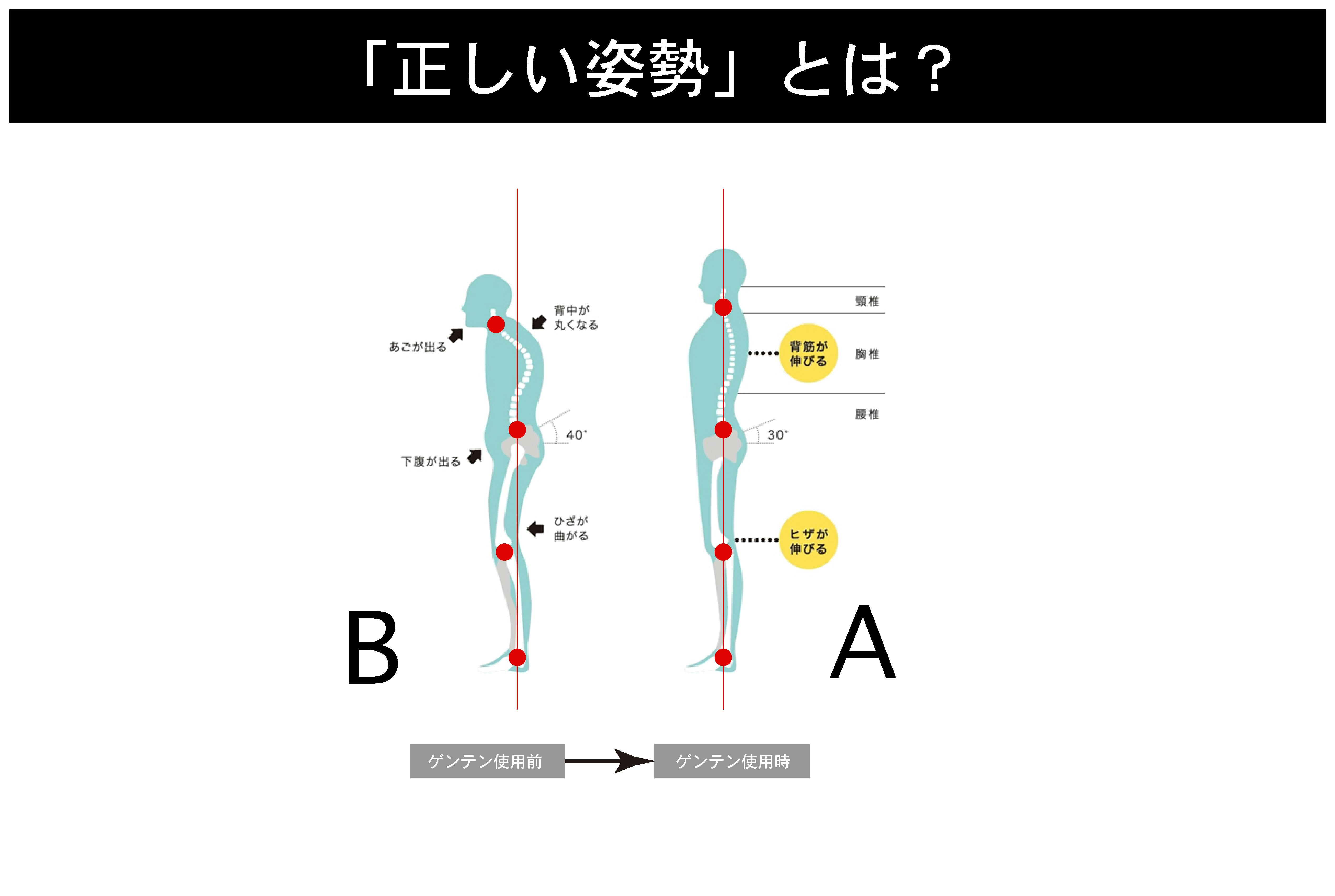 A,正しい姿勢を意識されるのはとても良い心がけですが現実的に考えた時に普段の生活の中でずっと正しい姿勢を意識すること は不可能に近いです。人と会話したり、仕事に集中したりと他に意識が向いた瞬間おそらく姿勢のことは忘れていると思いま す。ゲンテンインソールは足裏のアーチを整え正常な重心バランスを保つことができるので姿勢を気にせず無意識の状態でも 良い姿勢をキープすることが可能です。