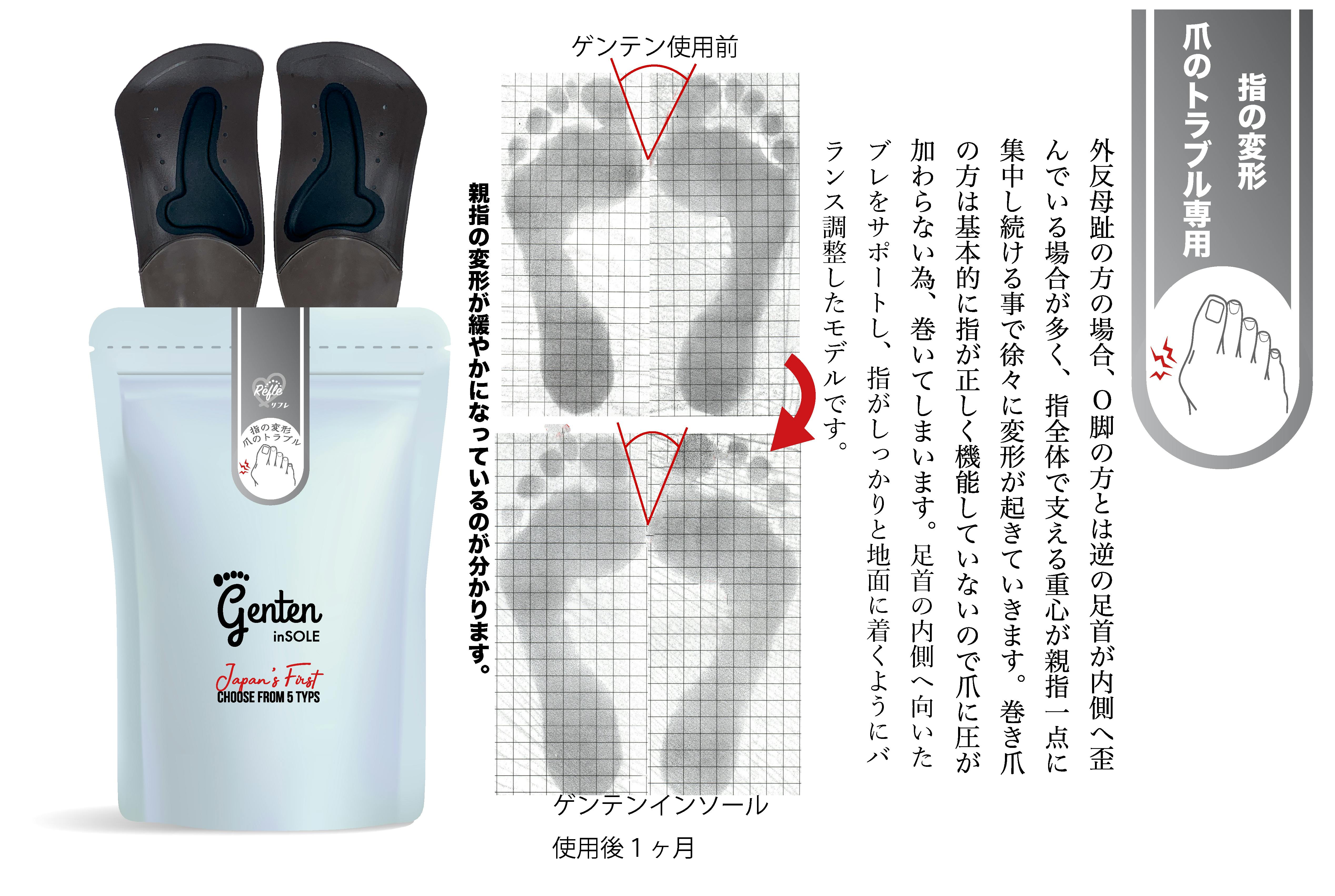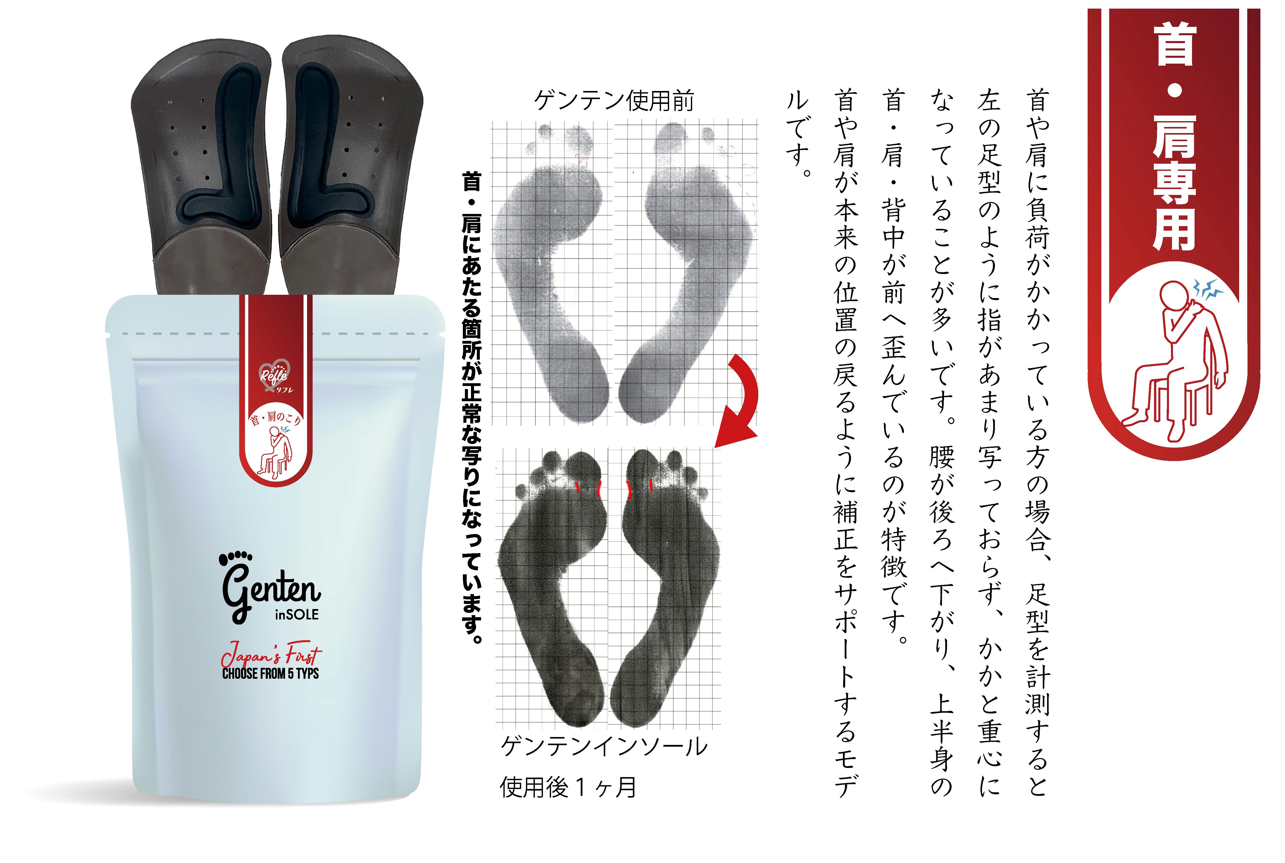 ゲンテンインソールは一般的な柔らかくクッションの効いたインソールとは違い、「補正インソール」と言うジャンルになり、硬くバネのように張りのある柔軟性を持ちます。例えば、ひざに悩みがある方が一般的なクッションの効いたインソールを使用した場合、歩行時の衝撃を素材が吸収してくれるのでひざにかかる負荷を減らすことはできます。ですが慢性的にひざに悩みを抱えている方は全身を支える土台である足裏のアーチが崩れ、姿勢が歪み、負荷をかけている可能性が高いです。ゲンテンインソールは5種類ありますがこれは姿勢の歪み方によって負荷のかかる部位が変わるからです。例えると前に傾いた方は首、後ろに傾いた方は腰にというように部位によって決まった姿勢の歪み方があります。このそれぞれの部位に負荷がかかっている姿勢の歪みを足裏のアーチバランスを整えることで日常の悪い姿勢から正しい姿勢へサポートするインソールです。