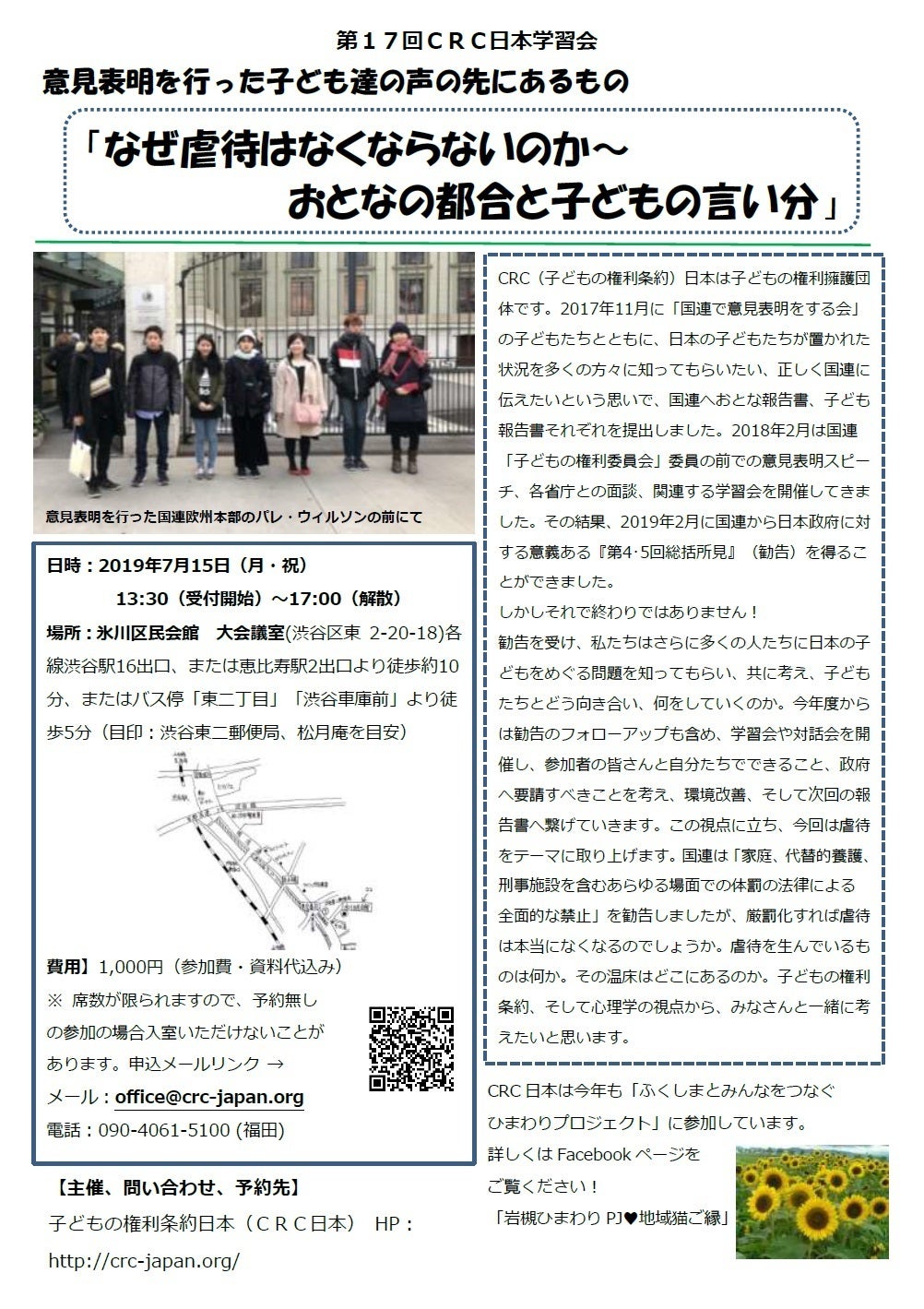 こんにちは。CRC日本です。2019年7月15日(月・祝)に開催予定の学習会のお知らせです。意見表明を行った子ども達の声の先にあるもの「なぜ虐待はなくならないのか〜おとなの都合と子どもの言い分」日時:2019年7月15日(月・祝)13:30(受付開始)~17:00(解散)場所:氷川区民会館 大会議室(渋谷区東 2-20-18)費用】1,000円(参加費・資料代込み)※ 席数が限られますので、予約無しの参加の場合入室いただけないことがあります。【主催、問い合わせ、予約先】子どもの権利条約日本(CRC日本) HP:http://crc-japan.org/メール:office@crc-japan.org電話:090-4061-5100 (福田)CRC日本とはCRC(子どもの権利条約)日本は子どもの権利擁護団体です。2017年11月に「国連で意見表明をする会」の子どもたちとともに、日本の子どもたちが置かれた状況を多くの方々に知ってもらいたい、正しく国連に伝えたいという思いで、国連へおとな報告書、子ども報告書それぞれを提出しました。2018年2月は国連「子どもの権利委員会」委員の前での意見表明スピーチ、各省庁との面談、関連する学習会を開催してきました。その結果、2019年2月に国連から日本政府に対する意義ある『第4・5回総括所見』(勧告)を得ることができました。しかしそれで終わりではありません!勧告を受け、私たちはさらに多くの人たちに日本の子どもをめぐる問題を知ってもらい、共に考え、子どもたちとどう向き合い、何をしていくのか。今年度からは勧告のフォローアップも含め、学習会や対話会を開催し、参加者の皆さんと自分たちでできること、政府へ要請すべきことを考え、環境改善、そして次回の報告書へ繋げていきます。この視点に立ち、今回は虐待をテーマに取り上げます。国連は「家庭、代替的養護、刑事施設を含むあらゆる場面での体罰の法律による全面的な禁止」を勧告しましたが、厳罰化すれば虐待は本当になくなるのでしょうか。虐待を生んでいるものは何か。その温床はどこにあるのか。子どもの権利条約、そして心理学の視点から、みなさんと一緒に考えたいと思います。詳細は添付チラシをご確認ください。CRC日本と「ふくしまとみんなをつなぐひまわりプロジェクト」について今年も当プロジェクトに参加いたします。詳しくはFacebookページ「岩槻ひまわりPJ♥地域猫ご縁」をご覧ください!【主催、問い合わせ、予約先】子どもの権利条約日本(CRC日本) HP:http://crc-japan.org/メール:office@crc-japan.org