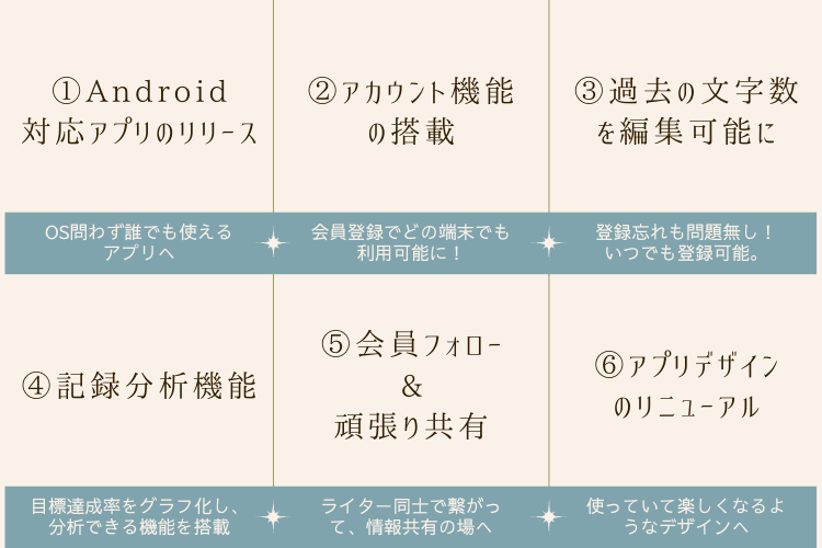 私はこのアプリをもっとたくさんのライター(文章を書く人)に使って頂きたい。そして将来的には、あらゆる世代・ジャンルの物書きが集うプラットフォームに作り上げていきたいと考えております。