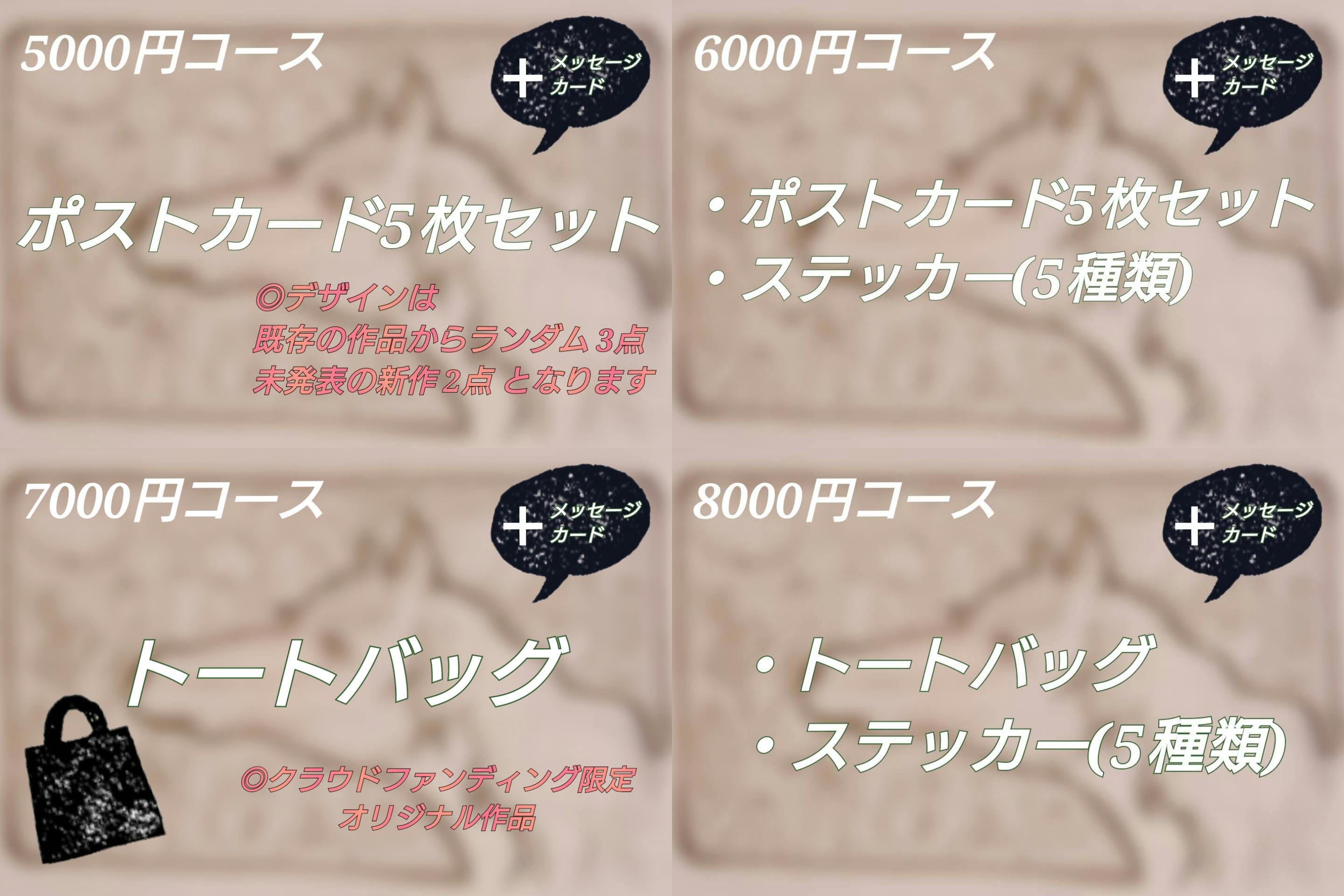 ◎ステッカー、ポストカードセット(一部)、トートバッグ、Tシャツは、全てクラウドファンディング限定デザインとなります