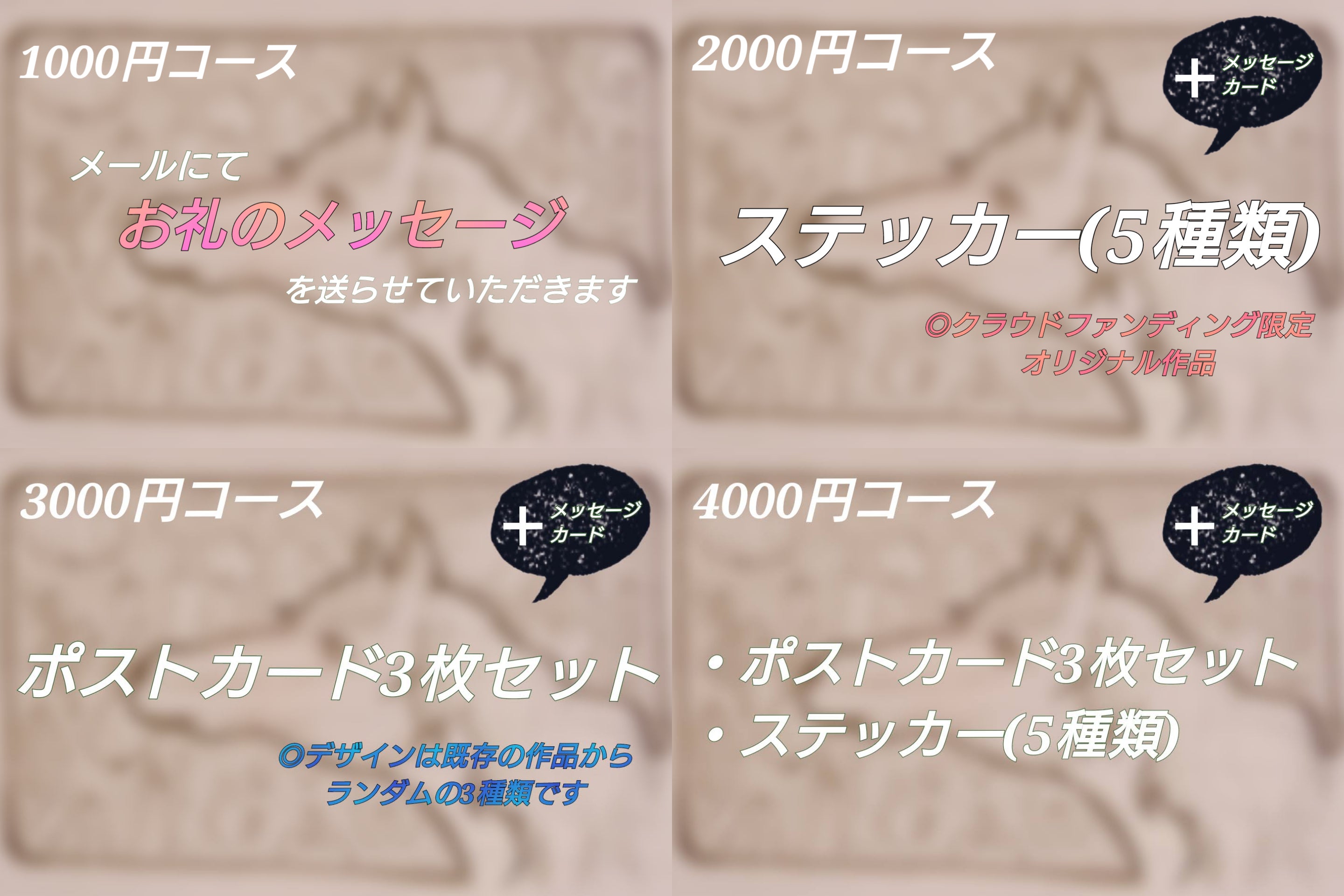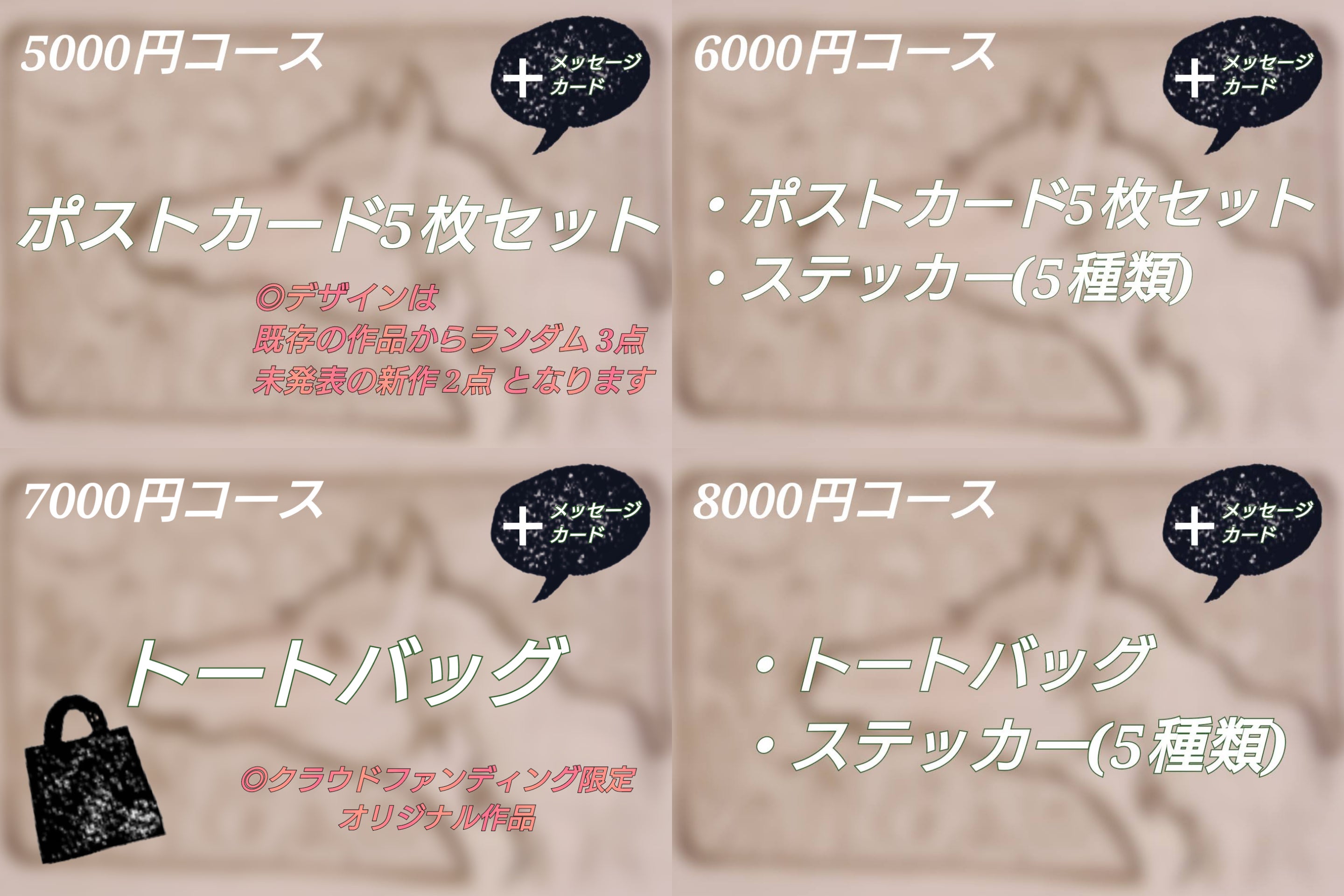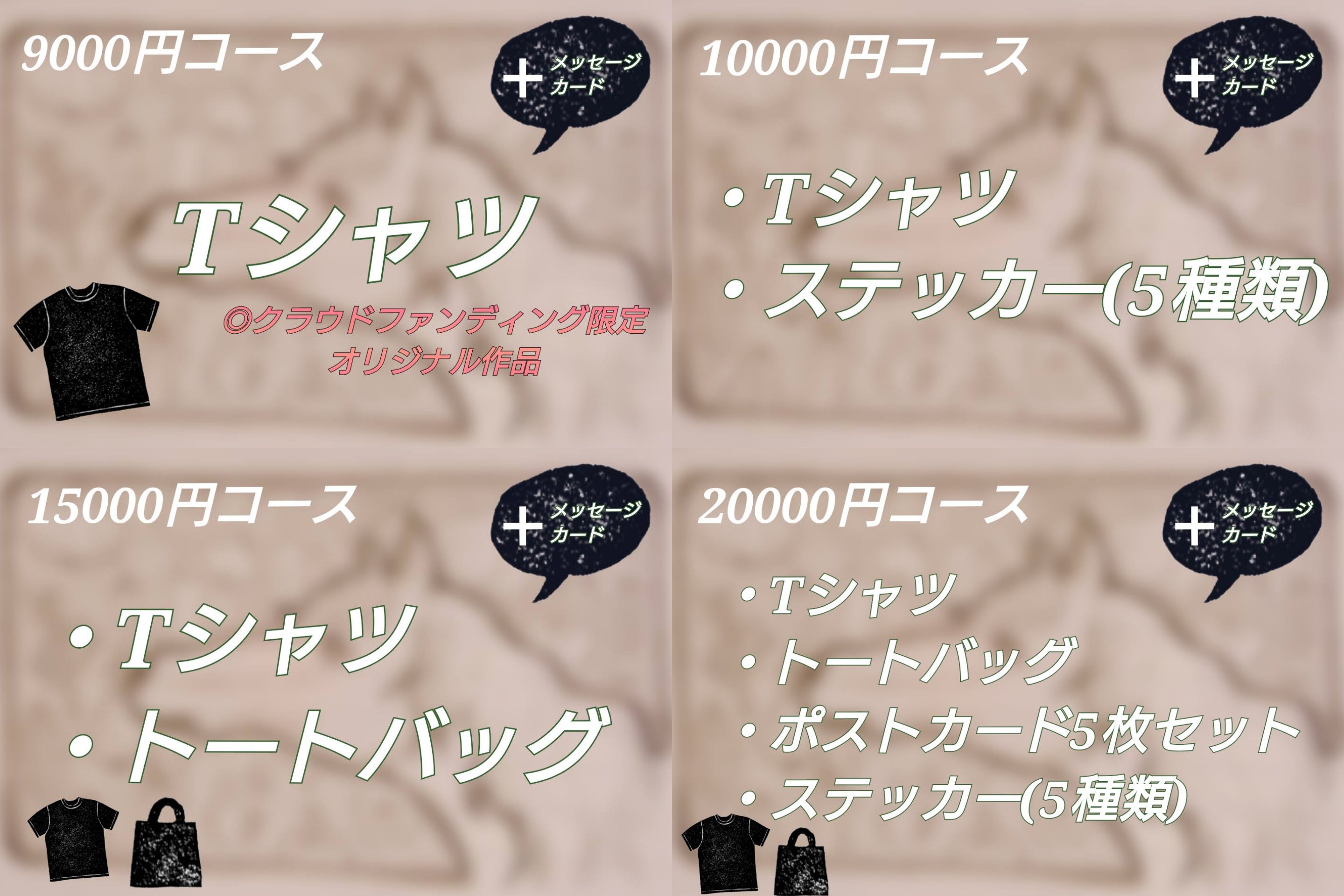 ◎ステッカー、ポストカードセット(一部)、トートバッグ、Tシャツは、全てクラウドファンディング限定デザインとなります